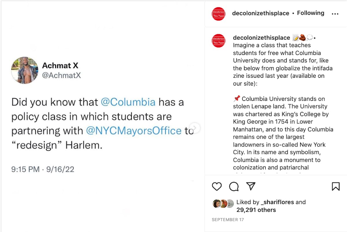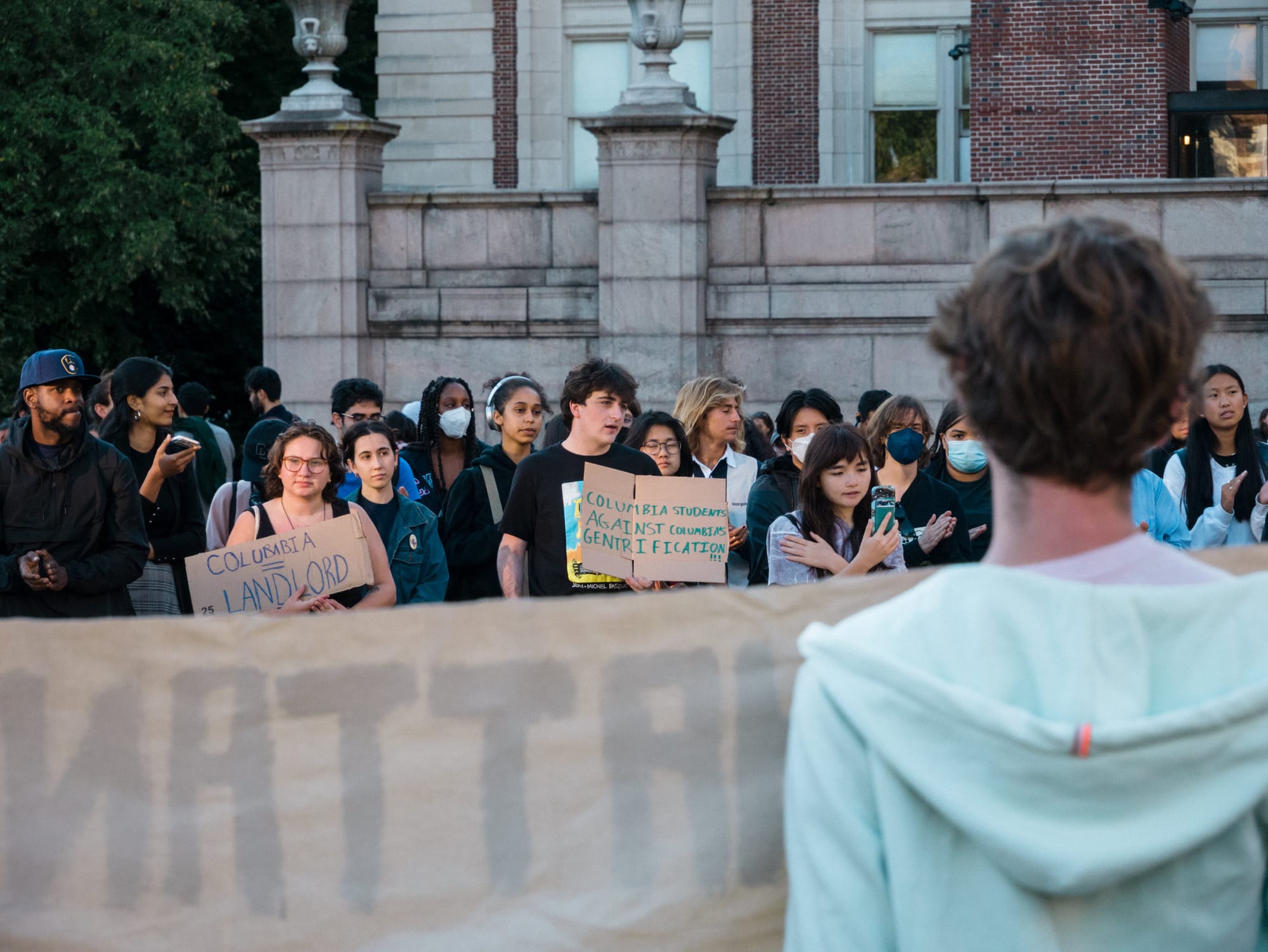 A tweet first posted by user @AchmatX, who identifies as a Harlem resident, went viral with thousands of likes and retweets. It was followed by action on the ground on September 22, when the anti-gentrification organization United Front Against Displacement (UFAD) and two Columbia student activism groups — the Housing Equity Project (HEP) and Student-Worker Solidarity — staged a protest against what they say is Columbia's gentrification of the neighborhood. UFAD made a list of demands, including a call on the university to cancel the course, which the advocacy group called "nefarious."