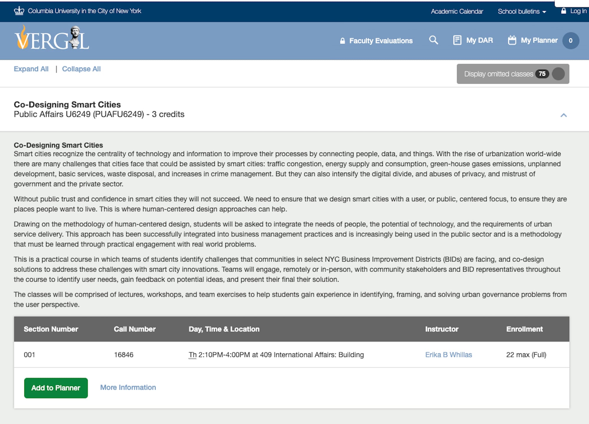 According to a description on Columbia's website, students enrolled in a course titled "Co-Designing Smart Cities," taught in the School of International Policy and Public Affairs (SIPA), would work with "community stakeholders" to come up with solutions for challenges facing the neighborhood. The class would consider "traffic congestion, energy supply and consumption, green-house gases emissions, unplanned development, basic services, waste disposal, and increases in crime management," among other areas of improvement.
