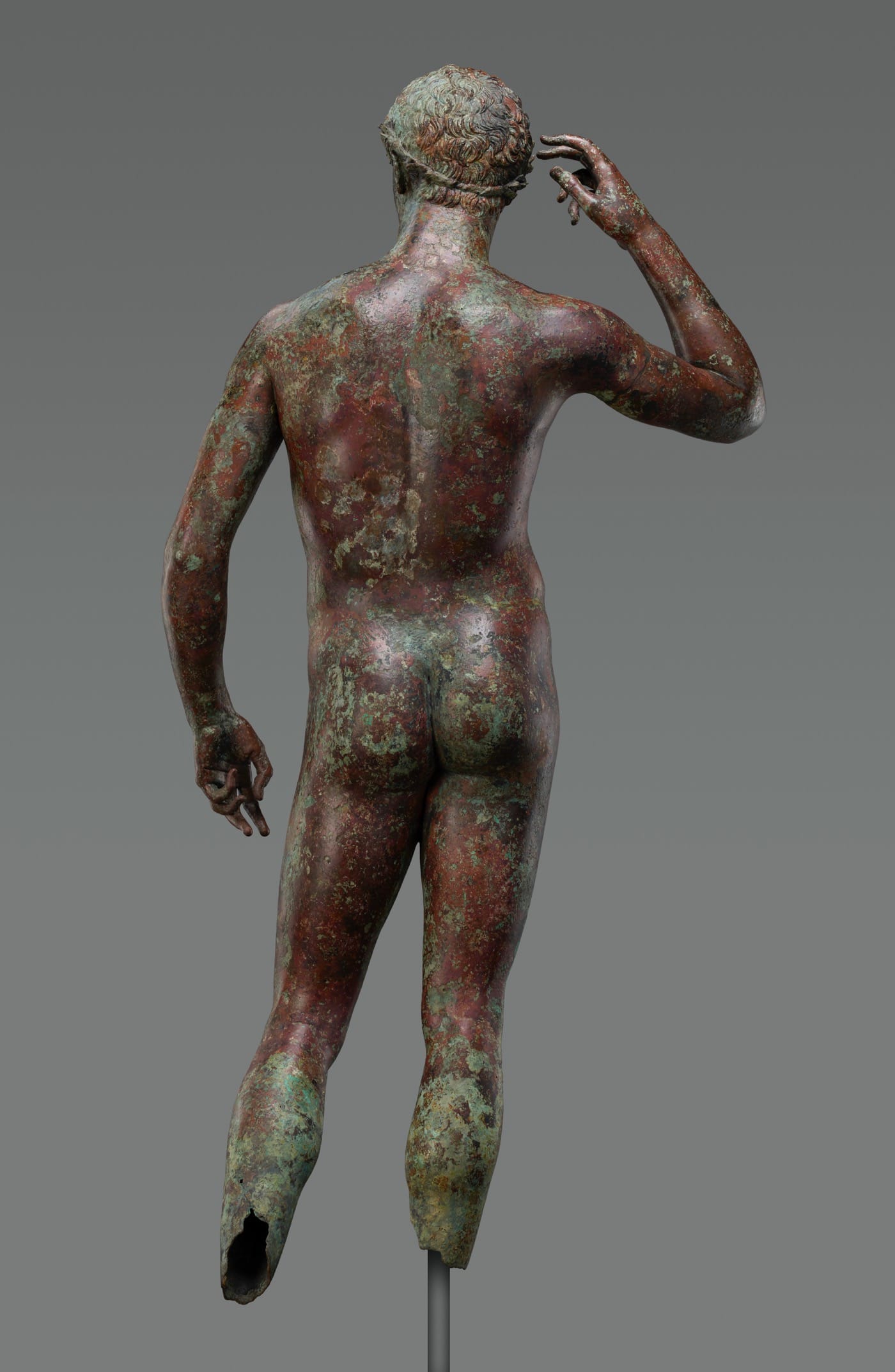 The “Victorious Youth” was discovered in the Adriatic Sea in June of 1964 by a northern Italian fishing boat, the Ferrucio Ferri working out of Fano, a port that lies between Ravenna and Ancona. The statue was either tossed from an ancient ship in transit or fell into the sea as a result of a shipwreck. Many have posited it was being transported on a Roman ship sending antiquities back from Greece. Originally, the “Victorious Youth” was likely first erected in a city such as Olympia, as confirmation of an athletic victory. The allowance of a bronze statue was a common honor given to athletes who competed and won their event — usually resulting in the athlete commissioning a statue for the town where he competed (e.g. Olympia) and one for his hometown. The cuts at the ankles of the “Victorious Youth” indicate that it was sawed off and removed from its original statue base, likely in a Greek city, and then shipped across the Adriatic Sea toward Italy. It would be two millennia before he would resurface.