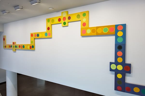 The first view of Shura Chernozatonskaya’s work is on the soaring white wall of the Brooklyn Museum’s lobby, spanning over forty feet and high above viewer’s heads. “Domino” (2012) is a painting installation of thirty-three canvasses set-out in a recognizable game formation: a yellow-to-blue chain tic-tacking its way across the threshold to the galleries. Each canvas is marked with approximations of the traffic-light symbol with circles of red/amber/green applied, in glowing transparency, to grounds ranging from pale lemon to deep indigo. Graphically cheerful in tone, the work nonetheless sparks significant cognitive tension. The integration of two distinct pictorially communicative systems, “domino” and “traffic light,” here orchestrates a string of yes/no, stop/go associations in a reception space where viewers’ expectations are strongest. “Domino” is a youthful work. It suggests a brave execution — an exuberant, if harmoniously imperfect, immersion in color and play — and is a fitting symbol to Raw/Cooked, the Museum’s bold new exhibition series of emerging artists of which Chernozatonskaya is the featured third.