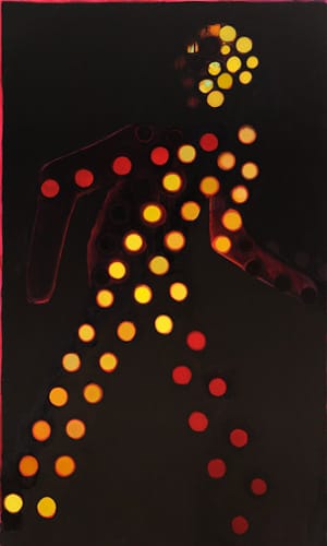 “Tracing the Figure: Man” (2012) is among the strongest of the works. Placed opposite portraits by Picasso and Goya, this painting picks up from where the Spanish red-to-black color sensibility leaves off. It depicts, six feet high, the iconic signage symbol of “man.” In this contemporary portrait “he” is slipping into tonal and existential obscurity, as the crimson pixels-shapes which define him sink into an expansive ground of subtly modulated darkness. The tableaux is re-activated by a slight frame of reddest-red underpainting left visible towards the top — a reminder that this “man” is, prior to his sign/symbol existence, a pure creature of color and imagination.