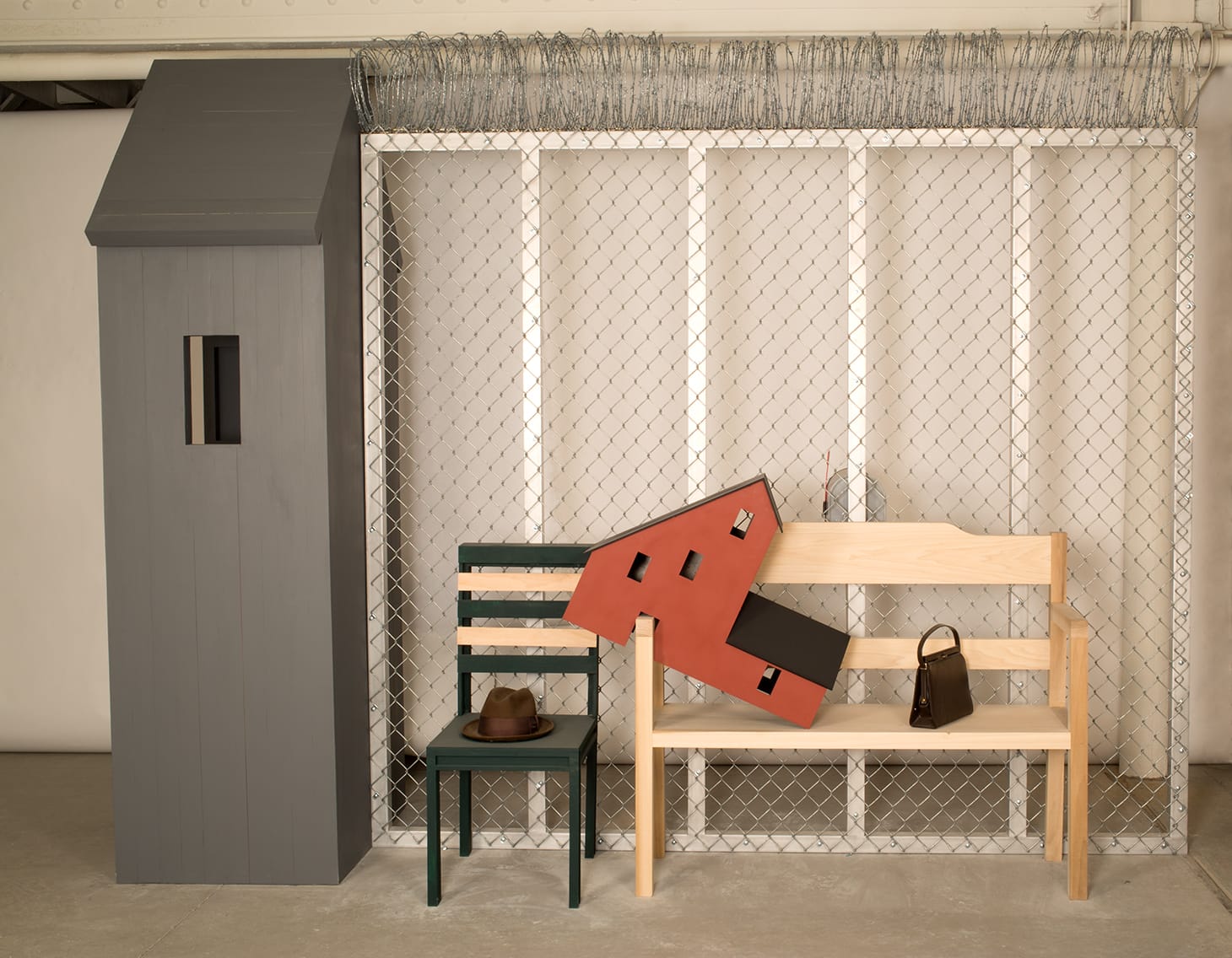 We then walked to another installation in his studio, “Room for Deportees” (2017). This work was inspired by President Trump’s 2017 executive order, which banned entry to the United States by citizens from seven predominantly Muslim countries. “You are standing by the wall along the border of the United States and then you go on the other side. There’s a room for deportees,” Armajani explained. He showed me a wire fence topped with barbed wire, alongside which he placed a chair with a man’s hat and a bench with a women’s purse. Alongside it, there was a small sculpture of a house. “It’s in memory of their home,” he said.