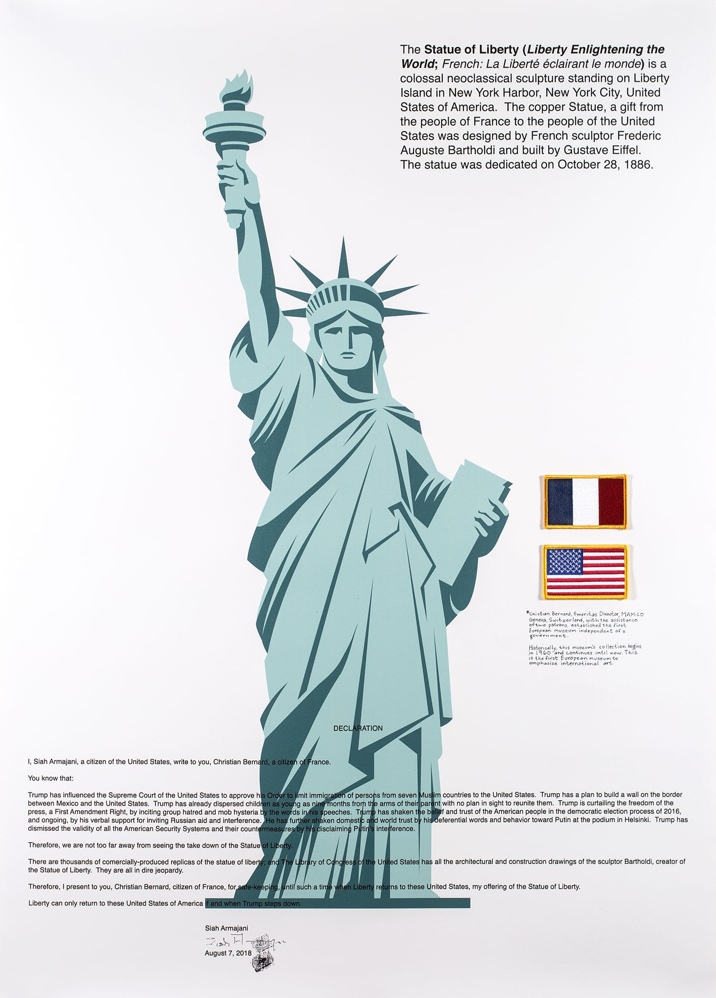 In the summer of 2018, the artist and curator Christian Bernard asked Siah Armajani to create an artwork for an art festival he was organizing in Toulouse, France. Armajani sent a massive 10-foot painting of the Statue of Liberty. In 1886, the statue had been gifted by France to the American people, and now the artist was returning it. Armajani inscribed the canvas with a signed and sealed declaration that read in part, “We are not too far away from seeing the take down of the Statue of Liberty … Therefore, I present you, Christian Bernard, citizen of France, for safe-keeping, until such a time when Liberty returns to the United States, my offering of the Statue of Liberty. Liberty can only return to the United States of American if and when Trump steps down.” A poem etched on the pedestal of the Statue of Liberty famously dubs the majestic torch bearer a “mother of exiles,” who cries: “Give me your tired, your poor, your huddled masses yearning to breathe free; the wretched refuse of your teeming shores. Send these, the homeless, tempest-tost to me.” The now iconic poem, “The New Colossus,” was written by Emma Lazarus in 1883.