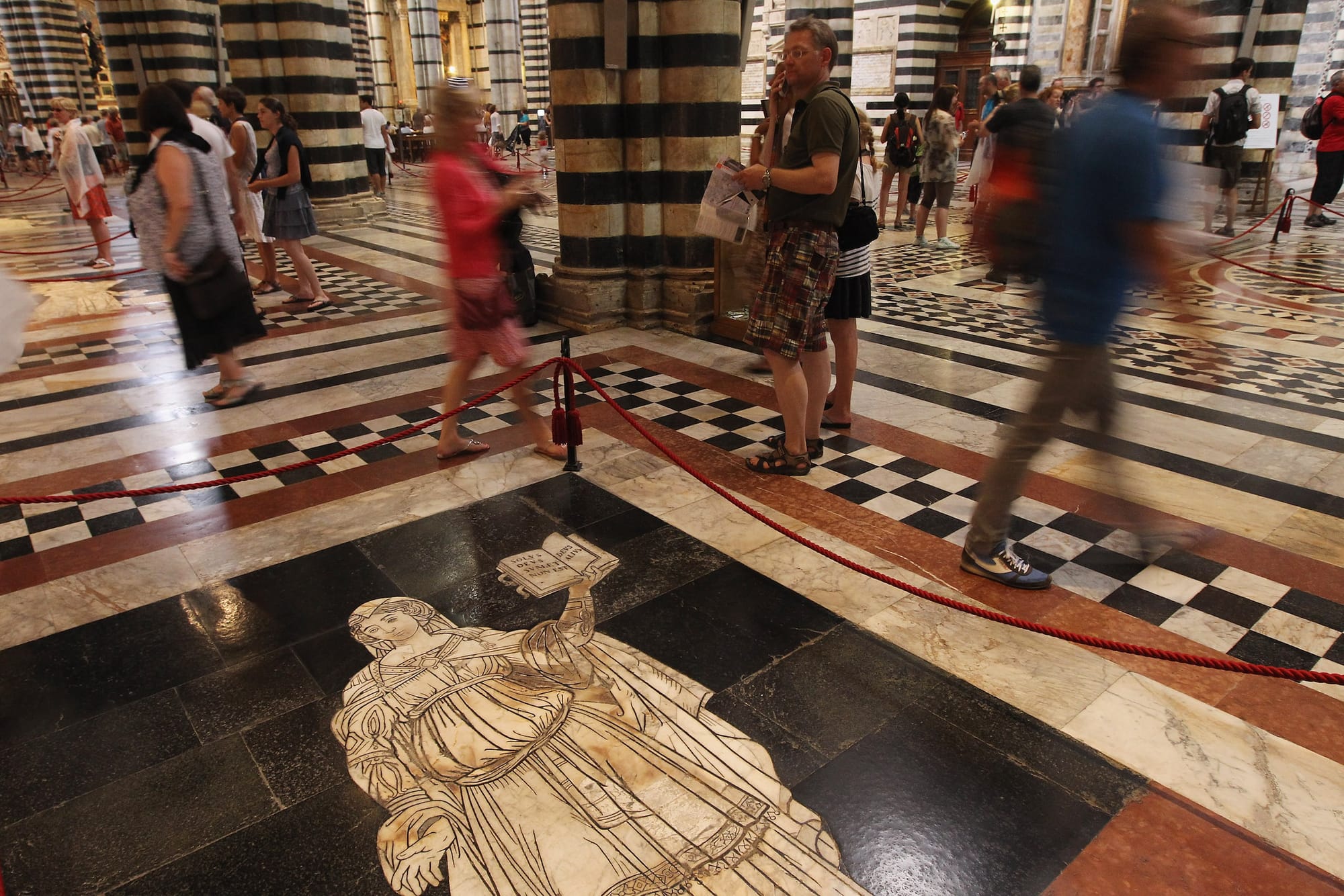 The black-and-white striped cathedral’s fragile inlaid floors spend most of the year covered by fiberboard panels for protection from foot traffic. Every year, after the city's traditional Palio di Siena horse race, which occurs twice a year, the floor is briefly uncovered for several weeks during the summer and the fall.