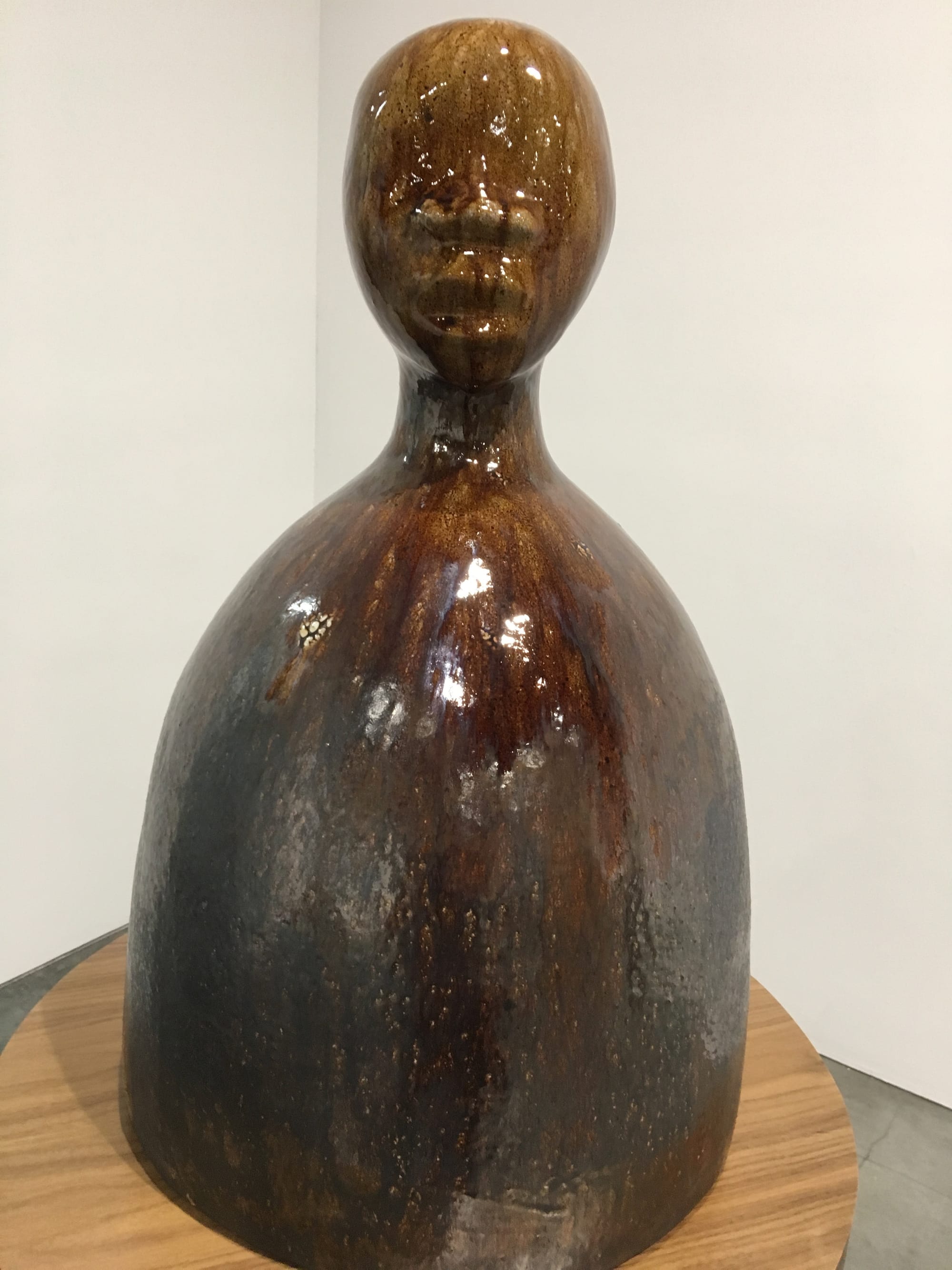 The figure is made of stoneware and Albany slip, and I confess I did not know what Albany slip is. It’s a special glaze made from glaciated clay found outside Albany, New York, that yields a deep brown color and an impermeable glassy coating. Once common in the 19th century, it is rare now; Leigh often employs old techniques for new purposes, often reaching back centuries to various kinds of African art.