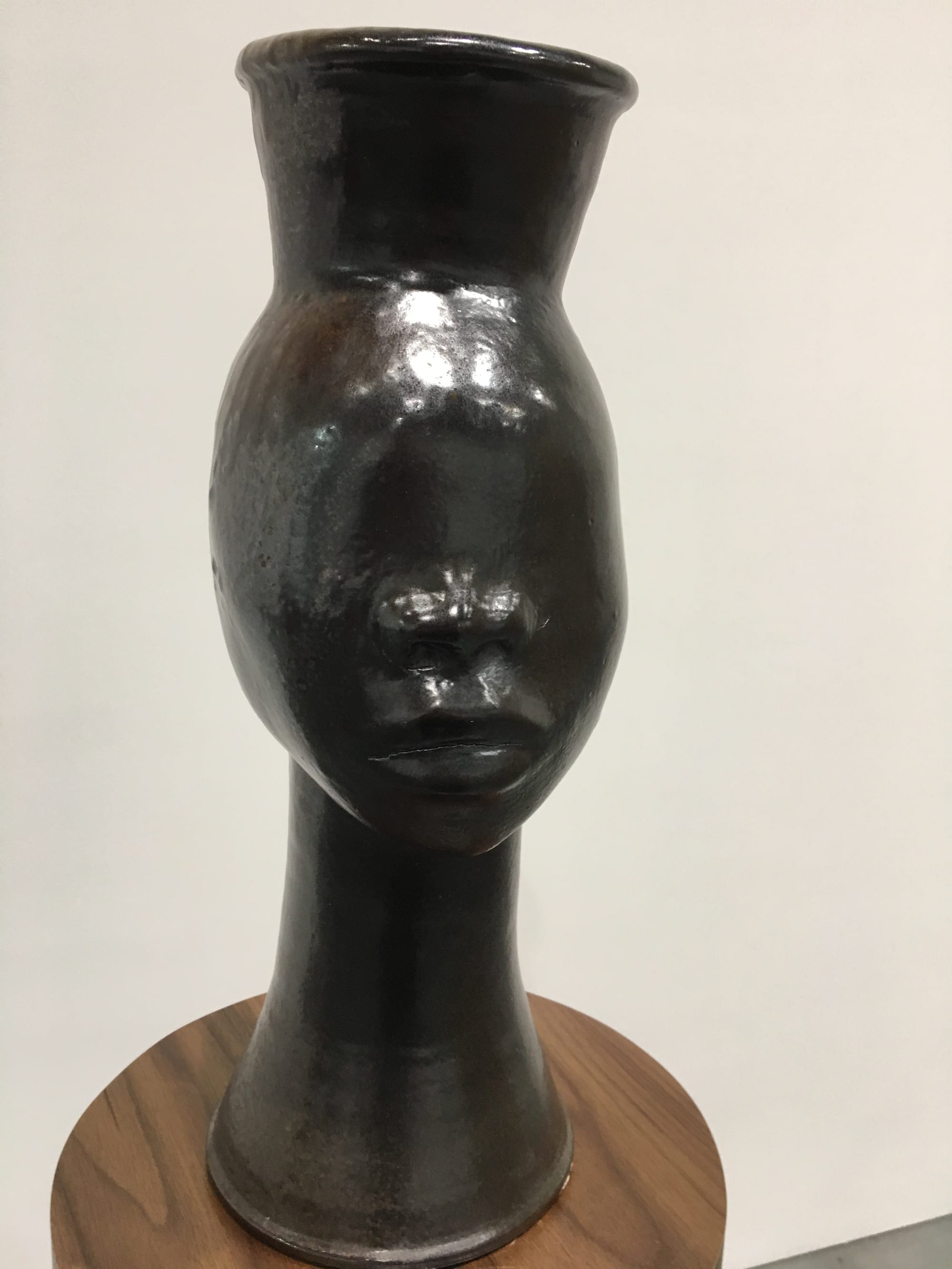 Nearby is another salt-fired stoneware piece, a black one in which a long neck (that may well also be an inverted jug) leads to a smooth female head, again with only a chin, mouth, and nose; protruding from the top of the head is another open-topped jug: “101 (Face Jug Series).” I stood for about 15 minutes in front of this work, completely enthralled, trying to shut down my rational mind, eliminate words, and instead become all eyes and feeling.