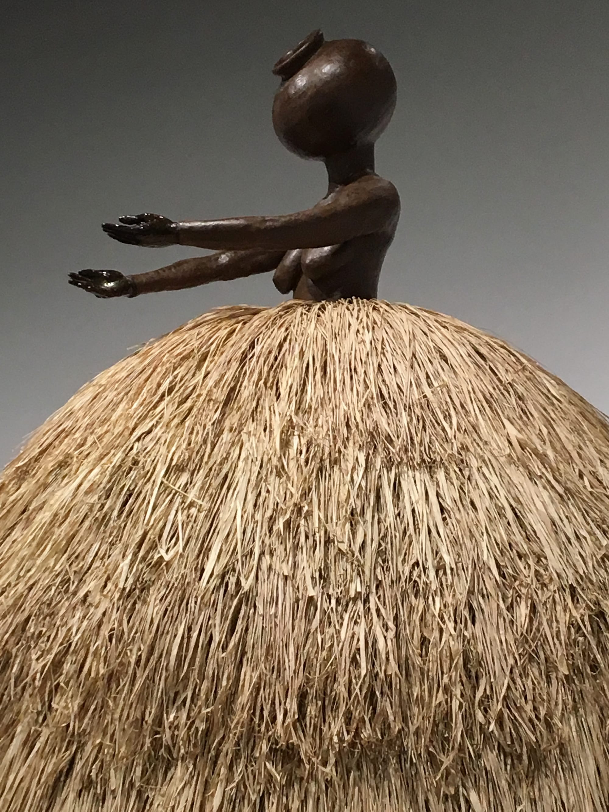 In the gallery’s main space, towering over everything at 10 1/2 feet tall and 10 feet wide is the spectacular “Cupboard VIII.” High overhead, a small, brown, commanding, and wonderfully eccentric female figure, naked from the waist up and with a jar — it could be from centuries ago — for a head is “wearing” a dramatic and voluminous raffia skirt.