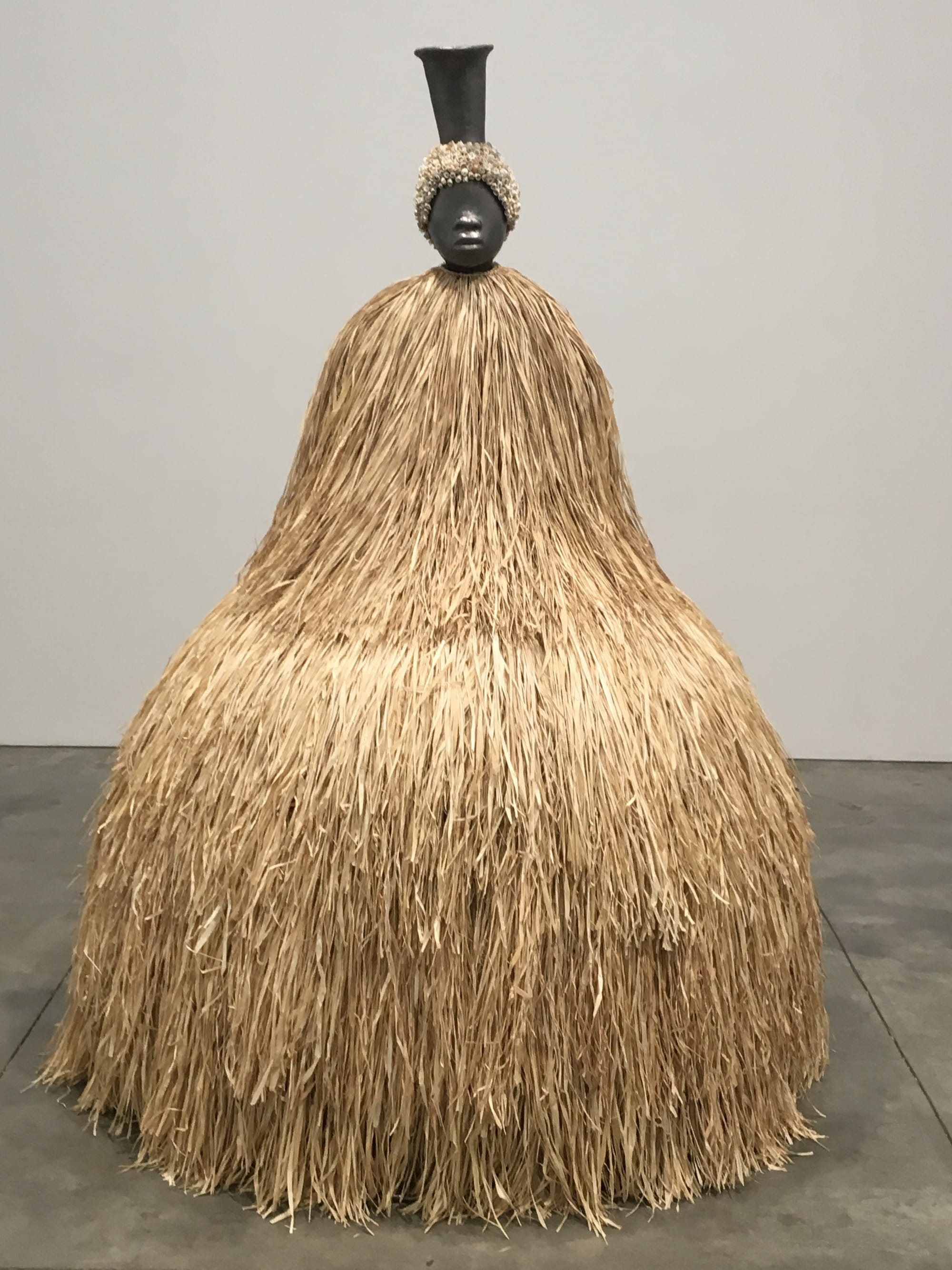 It was time very well spent. Throughout the exhibition, Leigh’s sculptures fuse and conflate black female bodies with architecture, pottery, and sometimes clothing, all seeded with African and African diasporic references spanning centuries and far-flung locales. African-American face jugs, made and used by slaves, are an important reference point.