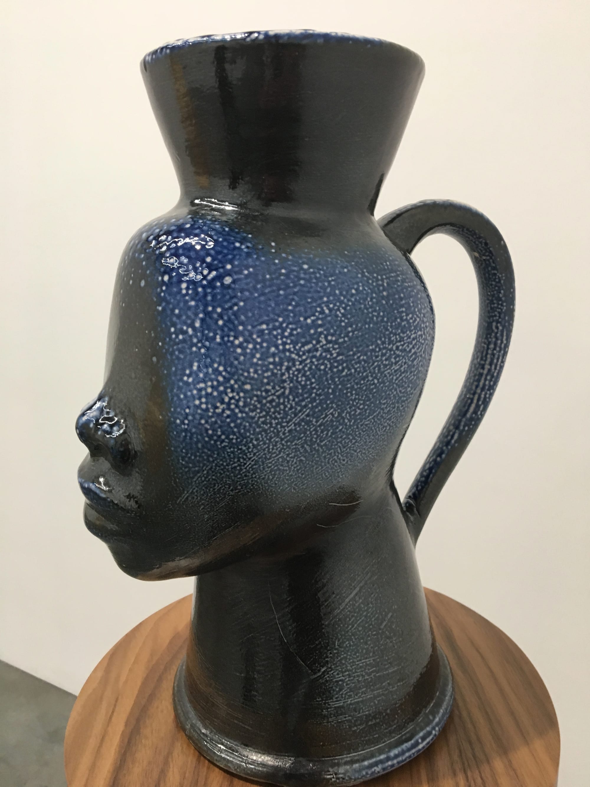 While Leigh’s sculptures have a big impact, often it is small things that make them so compelling: the slight, tiny-bit-precarious tilt of the black jar atop the raffia-robed figure’s rosette-covered head in “Figure with Skirt”; the way the surface of a single sculpture can shift subtly from sleek to gritty; the barely visible impressions of Leigh’s fingertips in the wet clay; the very precise and deliberate tilt of a chin. In the salt-fired porcelain “Head with Cobalt,” a black female bust is also a dual sided pitcher with a handle. The left side of the figure’s head is a deep blue speckled with hundreds, maybe thousands, of minuscule white dots. It’s as if the woman has absorbed a galaxy thick with stars, just on this one part of her body. Every now and then I visit an exhibition two, three, or four times, write about it, and then make a beeline back. This will be one of those times.