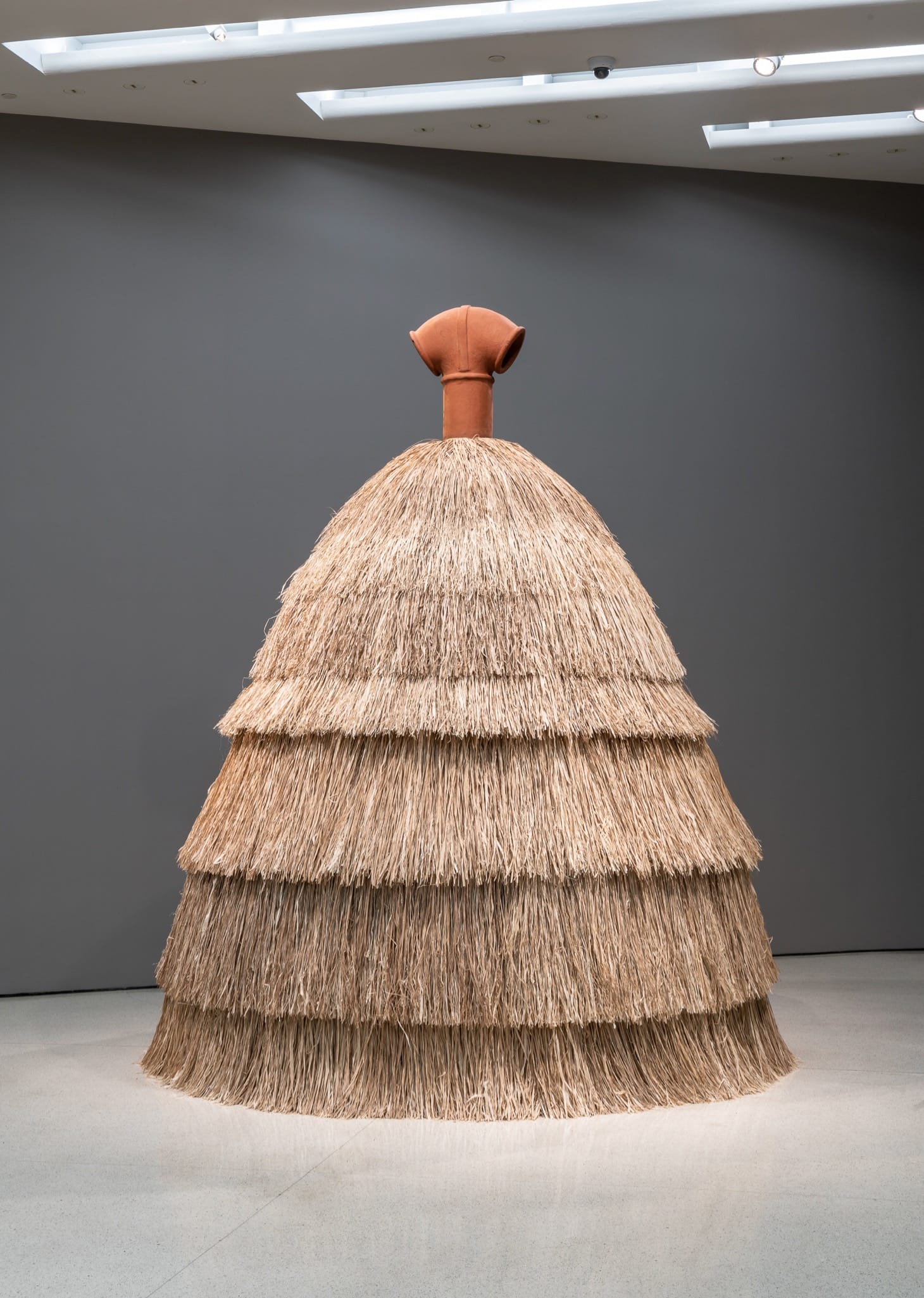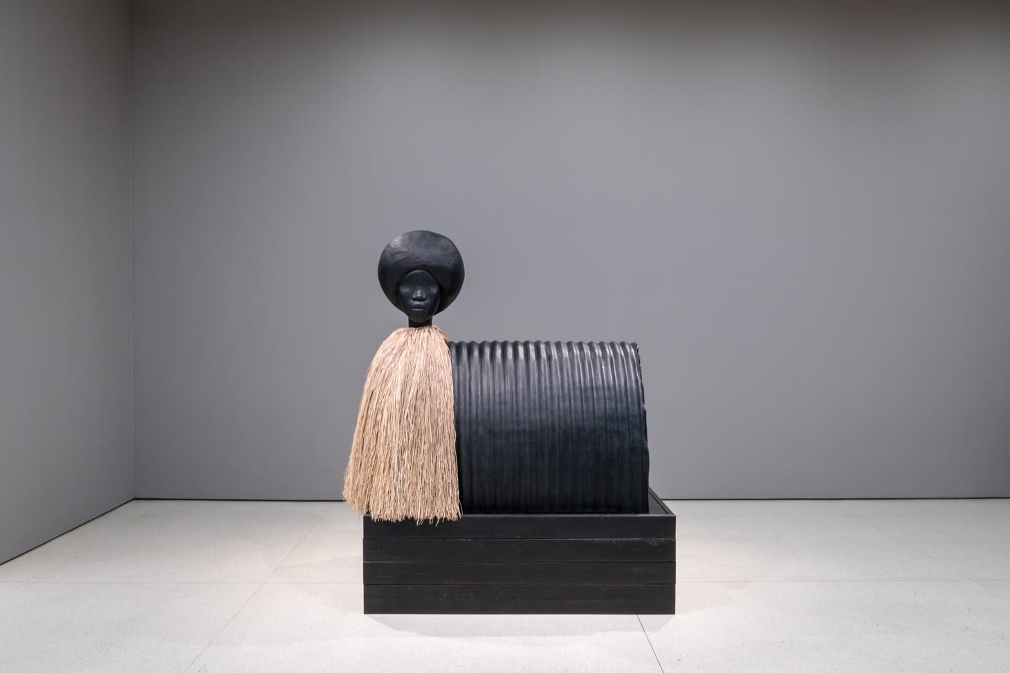 I wouldn’t normally expect an object that’s meant to defy the inquisitive gaze to be as large as this. But most of Simone Leigh’s structures here, at the Guggenheim Museum, are large enough that I cannot come close to being able to wrap my hands around them. The work “Panoptica” (2019), a large mound covered in raffia (the fiber from the leaves of a palm tree native to Madagascar) is about ten feet high as well. It’s topped by a bivalve terracotta chimney that suggests a woman’s shoulders and following this line of thought, the knoll becomes a skirt in my mind’s eye. The other works here — “Jug,” “Sentinel,” and “Loophole of Retreat I” (all 2019) — are also hybrid fabrications, comprised of a body, sometimes a head, which is topped by an almost perfectly spherical afro, and the faces feature obsidian skin, thick lips, wide noses, but no eyes.