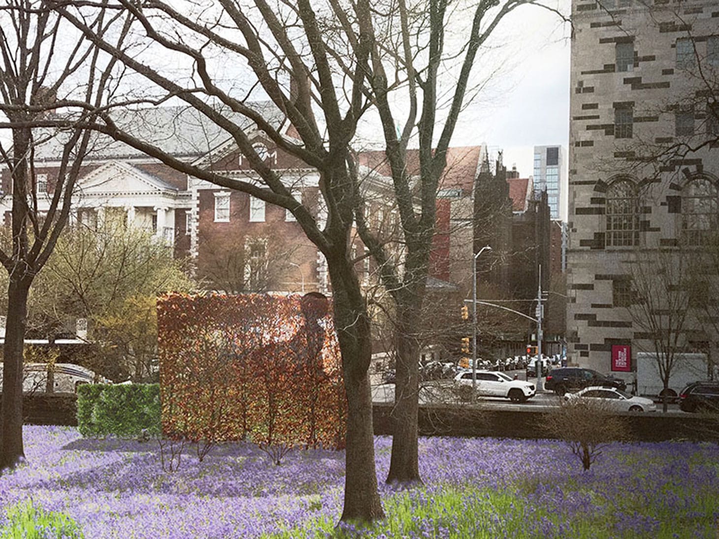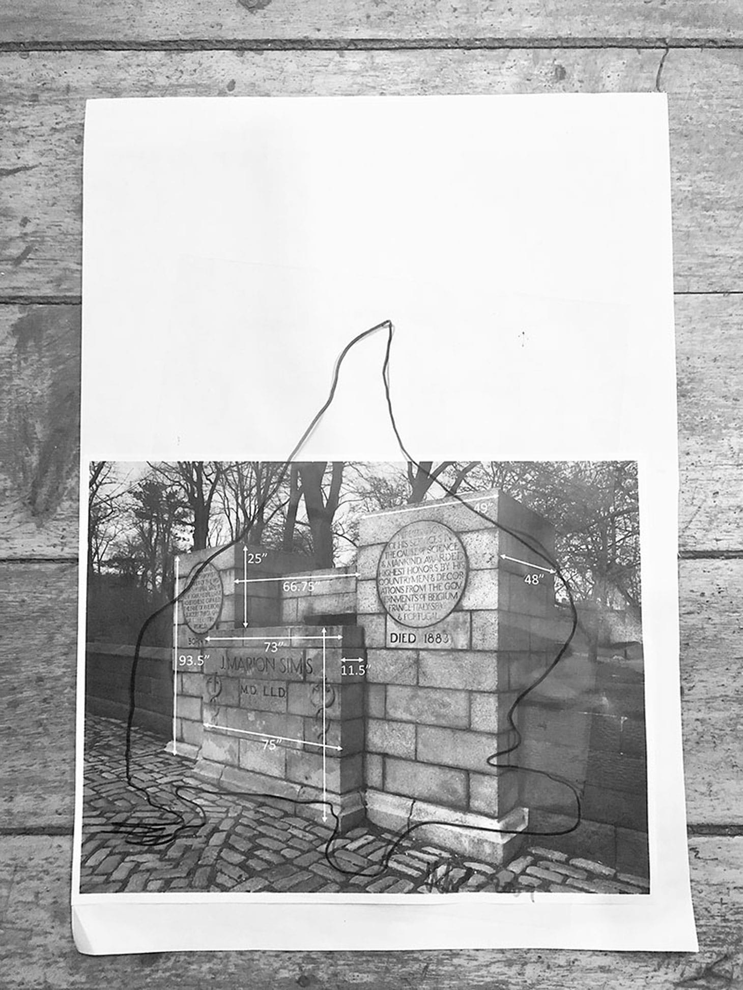 Leigh’s bronze sculpture features a resting figure of a Black woman draped in a fabric that recalls African traditions of dress. The sculpture is enclosed in a frame of holly shrubs, which will be surrounded by a carpet of bluebells every spring. The figure’s resting position, according to Leigh, references “a position originally used to give western painters the freedom to display the female figure by using the body of a woman of color as a proxy.” The reclining figure, she adds, is “a contemporary response to a dearth of representation of black beauty in Western Art.” The sculpture is named after some of the women abused in Sims’s experimentations: Anarcha, Lucy, Betsey, Henrietta, Laure, and a nod to his unidentified victims, “Anonymous.” The flora surrounding the sculpture, Leigh writes, is “a constantly changing glorification of the black body as monument through the four seasons.”