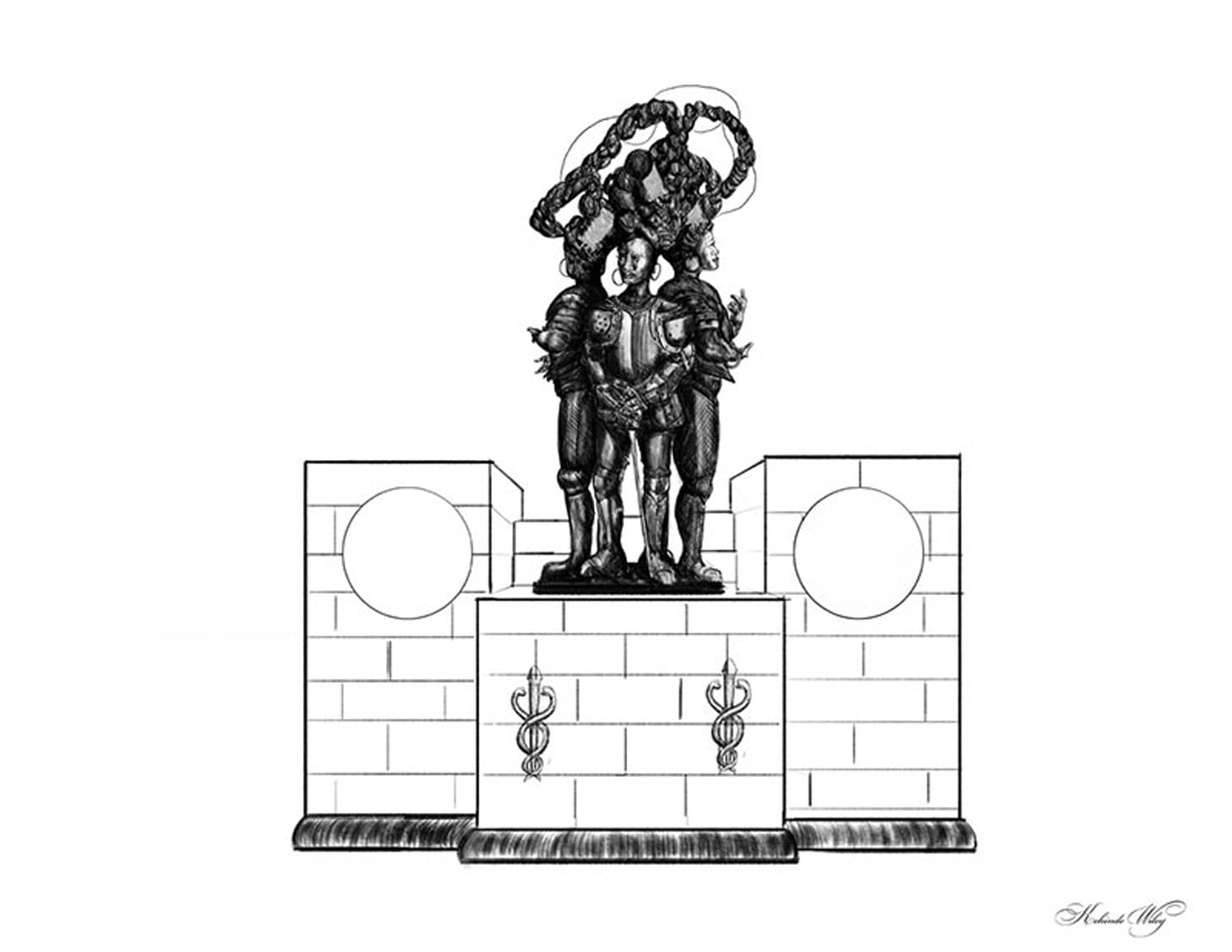 Wiley, who recently unveiled his Bronze monument “Rumors of War” (2019) in Time Square in New York City, has proposed a bronze sculpture the would be placed atop of the bare pedestal of the removed sculpture. Wiley’s proposal borrows from his previous work “Bound” (2014), which shows three women bound together by their hair. If selected, this new iteration would feature three unnamed doctors dressed in armor. “This new monument will at once specifically honor these three women while also honoring their community of colleagues, whose hard work continues to improve the lives of the citizens of the City of New York, the country, and our shared world,” Wiley writes in his proposal. “The three doctors will be sculpted dressed in armor, as an homage to the brilliance and power of the Black American women who have been pillars throughout Wiley’s life,” the artist’s proposal reads.