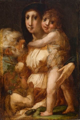 The composition intrigues, with its combination of passivity (Joseph’s adoring gaze) and aggression (St. John laying a chubby hand on the Madonna’s belly). So do the figures’ unresolved faces: dark pools for eyes, smeary mouths. Vasari explains, “It was Rosso’s custom in his oil sketches to give a sort of savage and desperate air to the faces, after which, in finishing them, he would sweeten the expressions and bring them to a proper form.” In “Holy Family” that sweetness isn’t there yet.