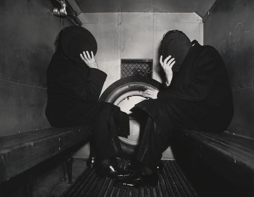 Unlike many of Weegee’s subjects — gangsters or gaudy citizens of the demimonde—who faced his camera with flagrant disregard, Charles and Arthur are twinned in their shame. Their desire to hide could be attributed to the location of their arrests — the bar at the Hotel Astor, the most famous gay rendezvous in all New York. These two young men — the paper gave their ages 28 and 32, respectively — very likely have more to hide than an encounter with the police. Even in the highly stylized composition, Weegee’s tabloid sensibility is felt; the camera seems to push into the van, it’s flash pressing against them, illuminating the back wall so as to contrast the darkness of their garb and articulate every last detail — the folds of the coats, the buttons, the crescent trace of each man’s hair just above the hat. They may have cloaked their faces, but the photographer subjects everything else to meticulous inspection: they are exposed in their concealment.