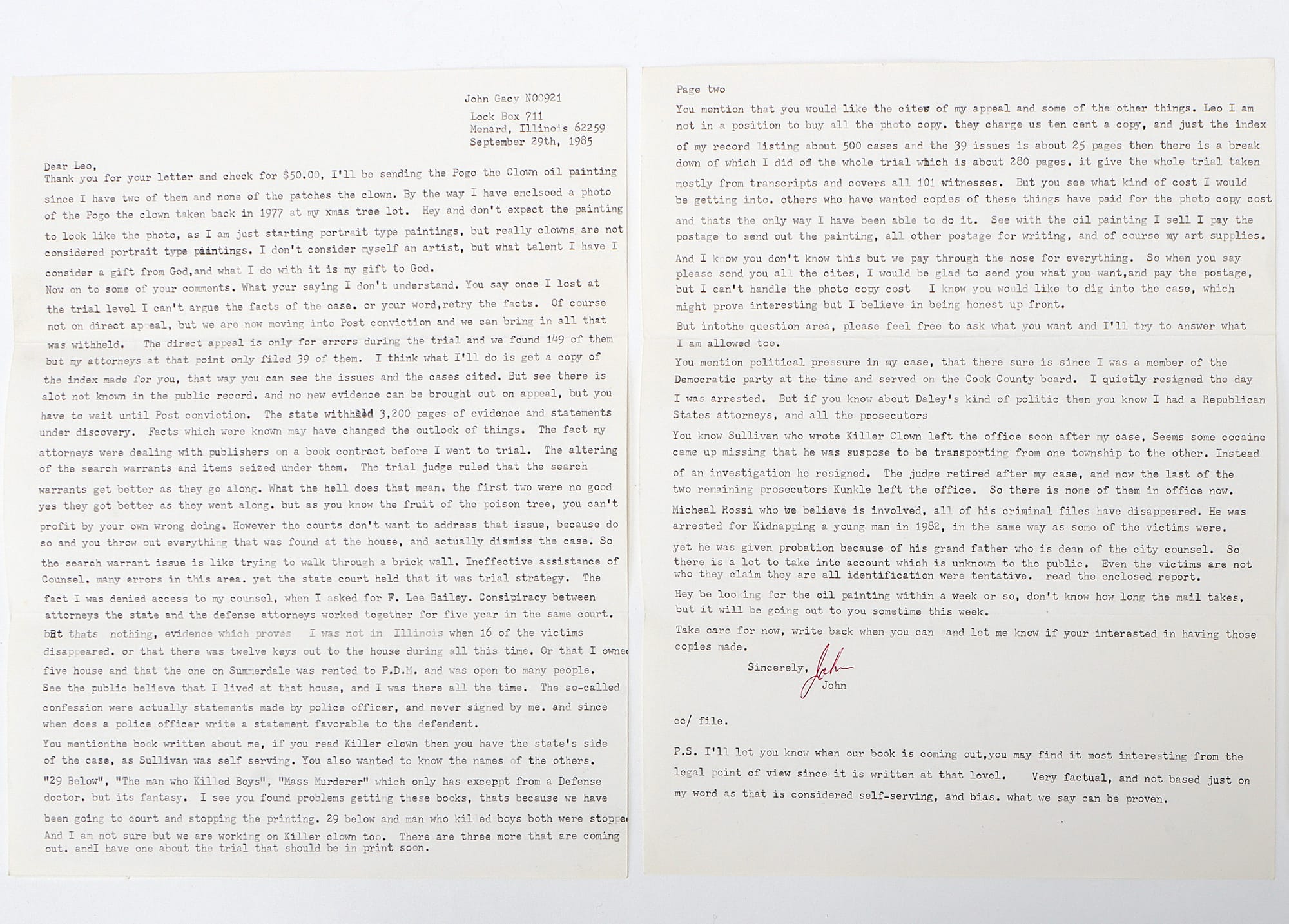 According to Gacy's pure stream of consciousness in the form of a typewritten letter that accompanied the auction lot, he sold "Pogo the Clown" to an attorney named Leo W. Dymowski in Baltimore, Maryland, for $50 in 1985. While the original letter to Gacy was not recovered, it appears as though Dymowski made some inquiries and comments on Gacy's case and requested additional case documents, which Gacy was unable to provide for financial reasons.