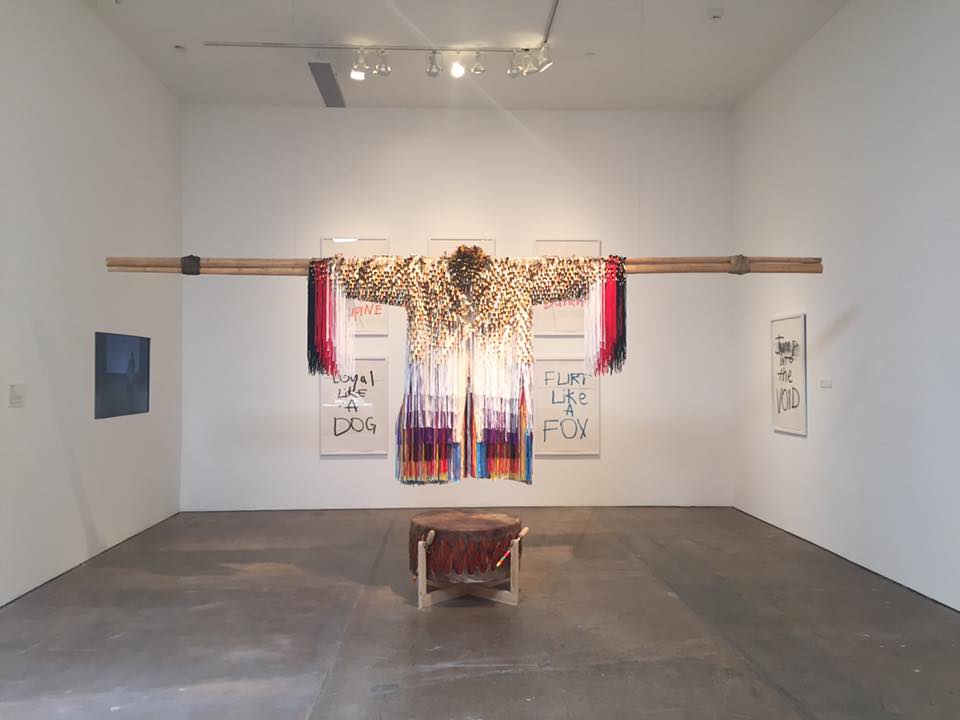 In contrast, a standout piece across from Mamnguqsualuk’s by Eric-Paul Riege, a young Diné artist from Gallup, New Mexico, comes across as powerful, reflective, and performative. Drawing on stories and the continuum of Diné existence and tradition, his installation represents this cultural continuum mobilized through his Indigeneity. The piece, comprised of looms that construct a hogan (a dwelling of the Diné people), containing two figures, dominates the gallery. Riege activated the work in the opening week as he performed his transforming into a sheep and meandered throughout the SITE galleries.