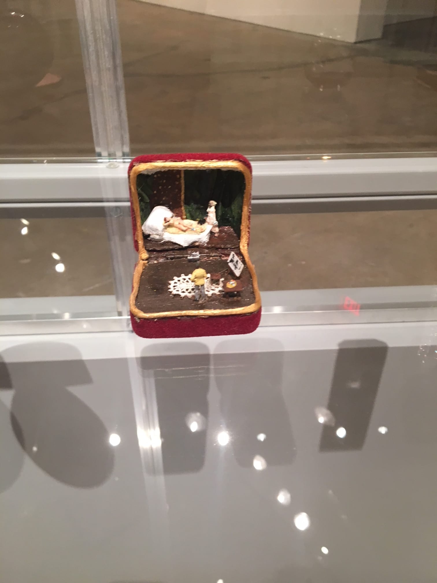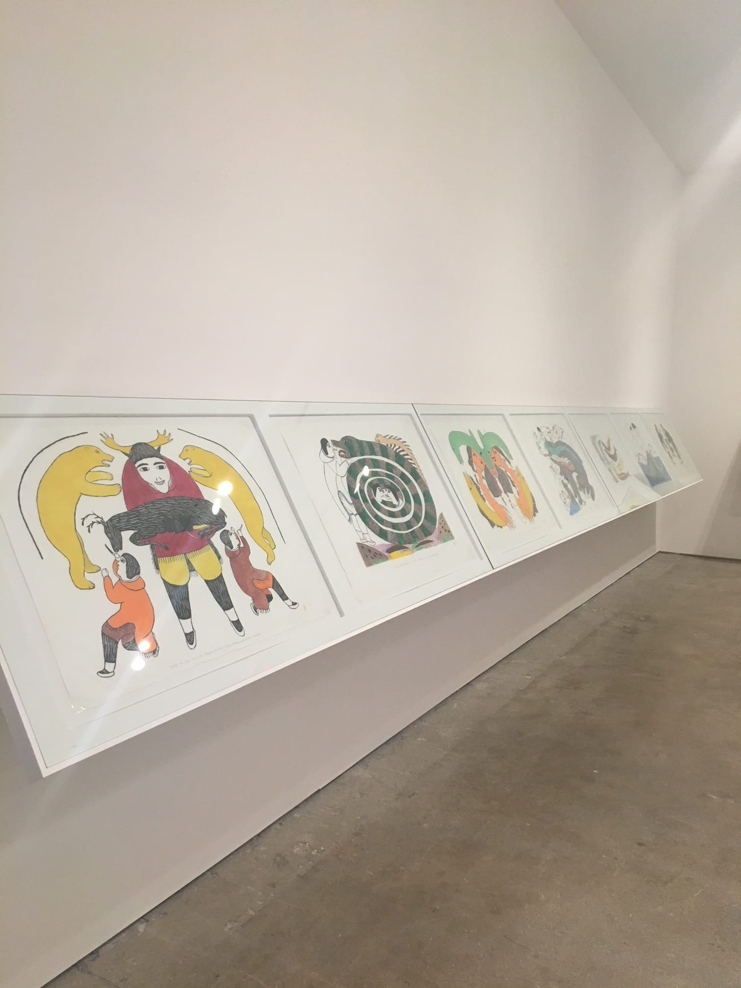 Another misstep was the treatment of Victoria Mamnguqsualuk’s work. The late Canadian artist, who was a seminal figure in Indigenous North American fine art and daughter of renowned Inuit artist Jessie Oonark, is represented by several colored pencil drawings and prints, as well as two textiles. Despite Mamnguqsualuk’s acclaim as an artist, the way her work is displayed recalls anthropological exhibits. The angled white cases feel disrespectful, portraying the work more as artifacts than fine art. (And, from a technical standpoint, the angle of the glass produces a disruptive glare from the lights overhead, so reading and photographing the work is a challenge.)