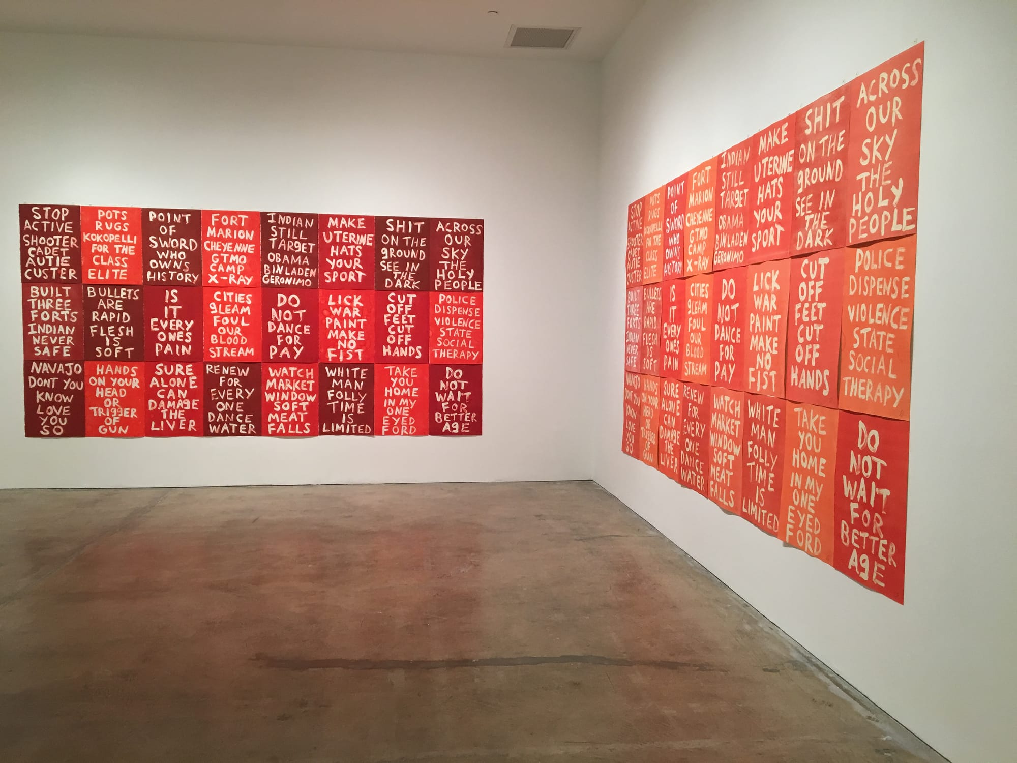 Among the highlights is Curtis Talwst Santiago’s installation of 51 small jewelry boxes filled with dioramas of art historical, historical, contemporary, and some seemingly commonplace subjects. The intimacy of their scale and their low installation inside of a glass greenhouse force the viewer to bend over and strain to gain a closer perspective. Across from Santiago’s series is another strong work, “Surviving Active Shooter Custer” (2018) by Edgar Heap of Birds (Hock E Aye Vi), part of his ongoing monotype series. Here the works have been printed at a larger scale than previously and, for the first time, are shown alongside the companion ghost print, creating a kind of mirror — a reflection upon reflecting. The prints have a lyrical and poetic quality that fits well within the narratives of colonialism, historic violence, and the survival of Indigenous bodies.