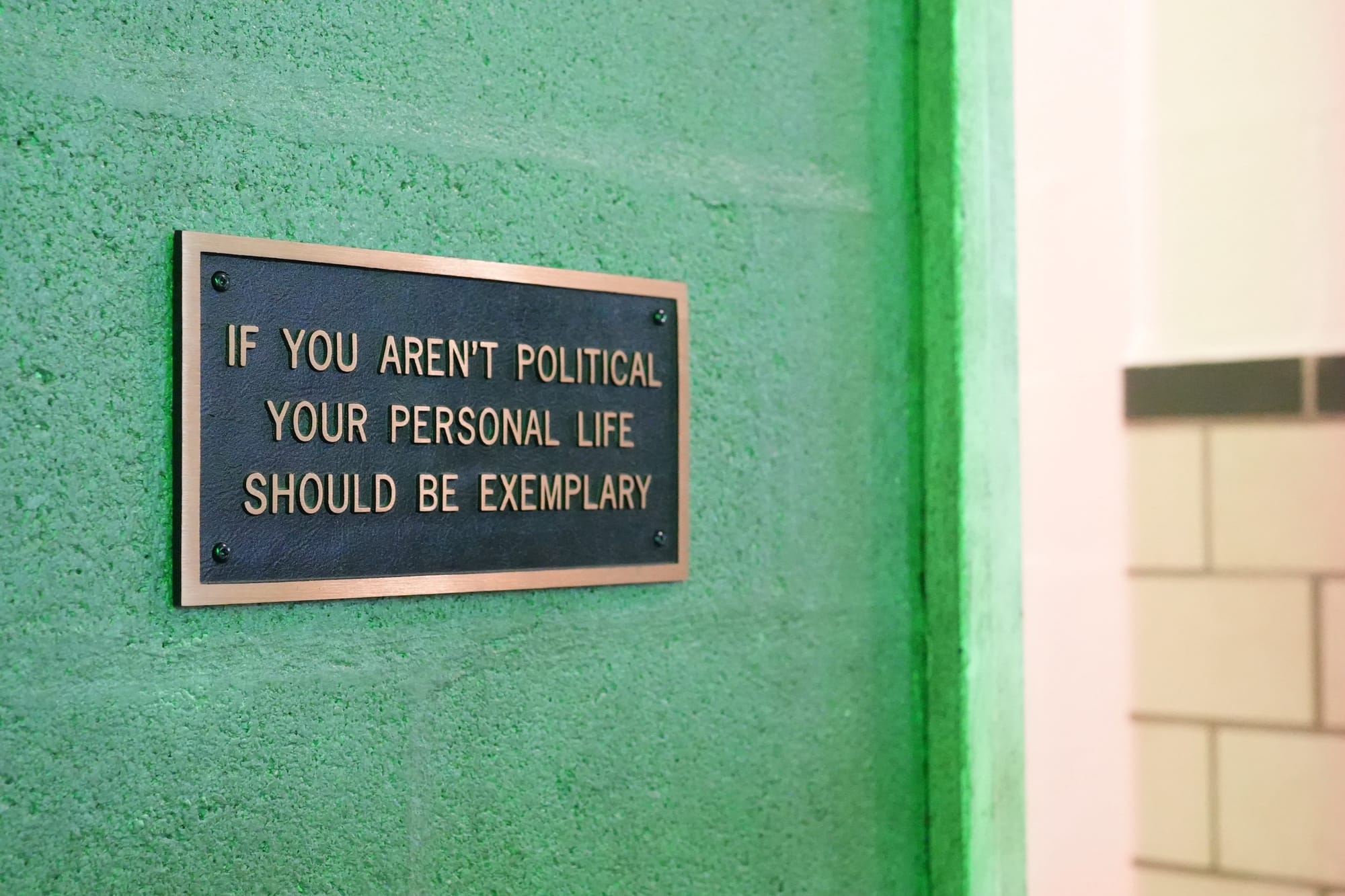In the works on view, too, there are nods and winks to that romanticized backdrop of teenage dreams and disillusionment, but they are nuanced and sometimes subversive. On a performance stage in the gym, Andrea Bowers's epic neon installation "Fight for the Living, Mourn for the Dead" (2024) reminds viewers that "climate change is real" in pretty, bright-green cursive letters that appear taken directly from the popular girl's composition notebook. What appears to be a supply closet is entirely overtaken by Eugene Macki's "Noumena" (2023–24), an absurdist installation consisting of a pile of wood and cardboard squares.