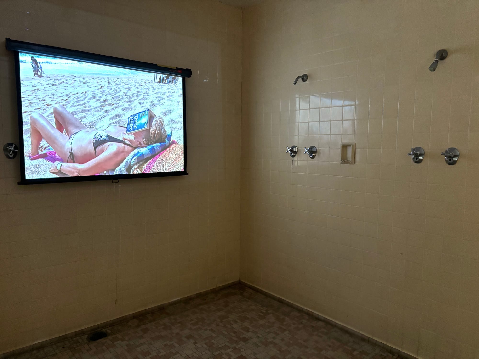 Along hallways and on the walls of classrooms painted in a wide palette of colors, a science lab, a library, and a cavernous gymnasium so remarkably untouched that it still buzzes with the energy of a pep rally, pairings of works by over 80 artists yield unexpected dialogues. The wacky canvases of Rebecca Morris mingle with the architectonic Formica-and-particleboard sculptures of Manfred Pernice, and Talia Chetrit's photographic snippets of urban life coexist with Francesca DiMattio's tantalizing ceramic caryatids. A spherical sculpture by Haegue Yang protrudes improbably from a chalkboard; Miguel Calderón's "Best-seller" (2009), a 30-minute video that juxtaposes audiobook excerpts with footage of tourists covering their faces with the same novels while tanning, lures us into a locker-room shower.