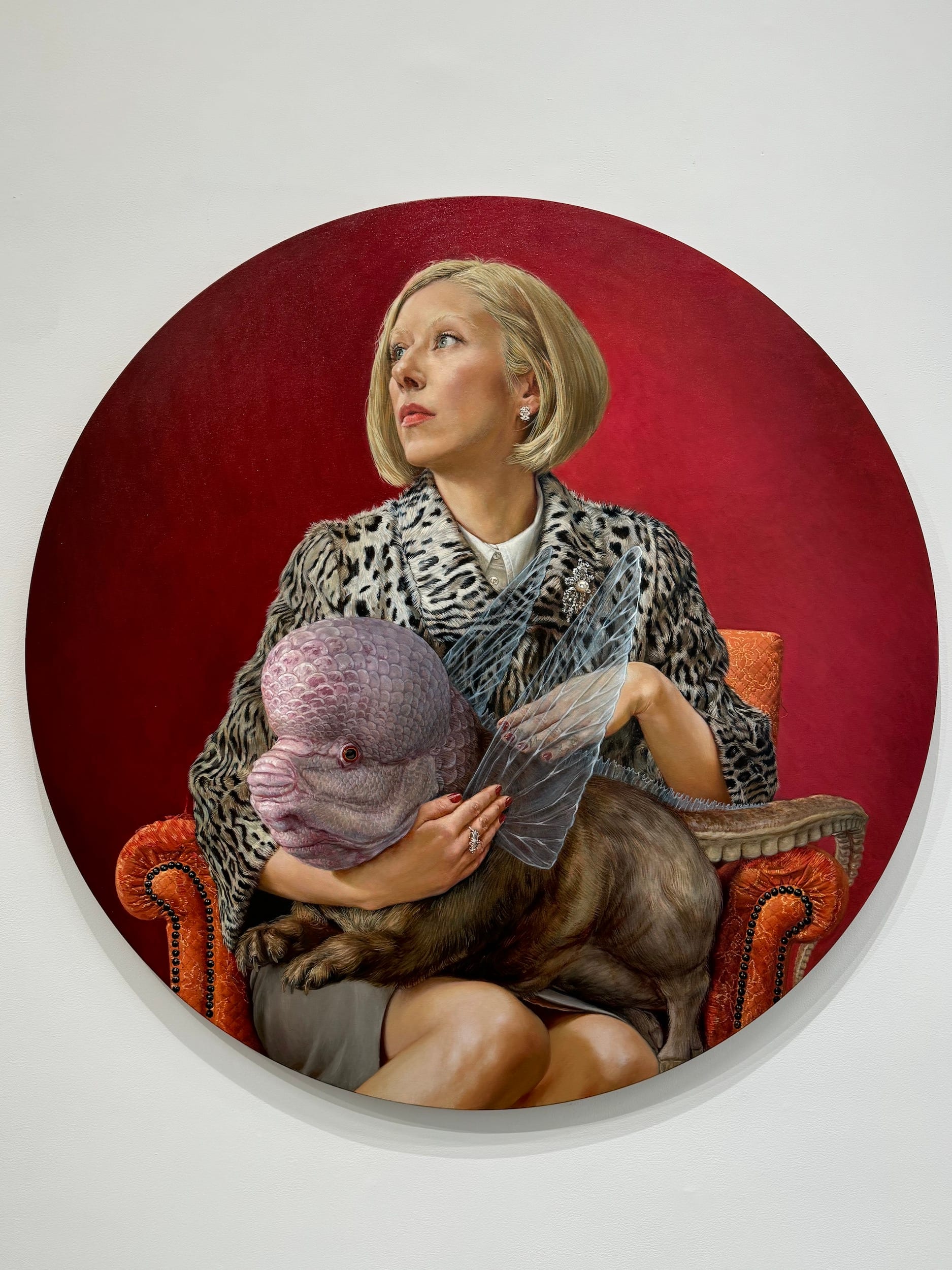 With their current exhibition at Sargent’s Daughters, Russian art collective AES+F have found a sly way to call out the 1%. The sardonic hyperrealist paintings of the Inverso Mundus series portray wealthy individuals in designer clothes cooing over their strange hybrid luxury pets. For example, in “Woman with Brainfish” (2022), a blonde bombshell’s posh appearance is disrupted by a grotesque chimera in her lap. The paintings are a response to the collective’s disgust at the Russian elites who have stood by and profited from Putin. Whereas so many images in visual culture glamorize the 1%, AES+F, now based in Berlin, comment on the elite’s moral lapses in the contrast between their superficial beauty and the monstrous creatures they so lovingly nurture. — Daniel Larkin