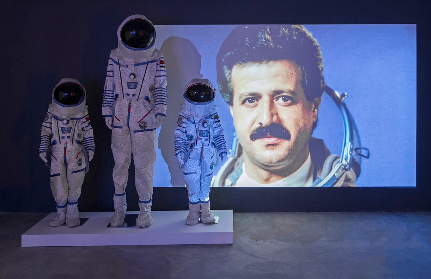 Legacies of other 20th century histories, specifically after the collapse of the USSR in western Asia, are material for Halil Altindere and Almagul Menlibayeva. Altindere’s multimedia “Space Refugee Project” (2016) was inspired by the story of the Soviet-trained Syrian cosmonaut Muhammed Ahmed Faris who has been living as a refugee in Istanbul since 2012. The pathos of the story of his training for a cosmic future with the Soviet space program, his country’s pride in their astronaut, his one visit to the Soviet space station in 1987, and the subsequent breaking up of the national narratives of both the USSR and Syria is then given an ironic twist with the idea that other planets should be considered as a destination for Syrian, and maybe all refugees. Almagul Menlibayeva’s 5-channel video work “Kurchatov 22” (2012) gives voice and visible form to unsuspecting people who also suffered from a damaging legacy of the Soviet era. The work focuses on a 18,500 km2 area in what is now Kazakhstan that was subjected to the Soviet nuclear testing program for forty years, with total disregard for the indigenous community and the Russians who were sent to work there. After the disintegration of the Soviet Union in 1989, the site was abandoned and the details of what took place there are still not openly known, but the effects on health and life expectancy are a real and ongoing legacy. Menlibayeva blends interviews and documentary film footage with aesthetically beautiful staged and performed images that add another layer of visual power to a disturbing history that could easily slip away into oblivion.
