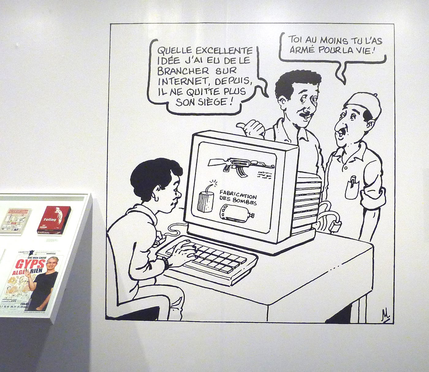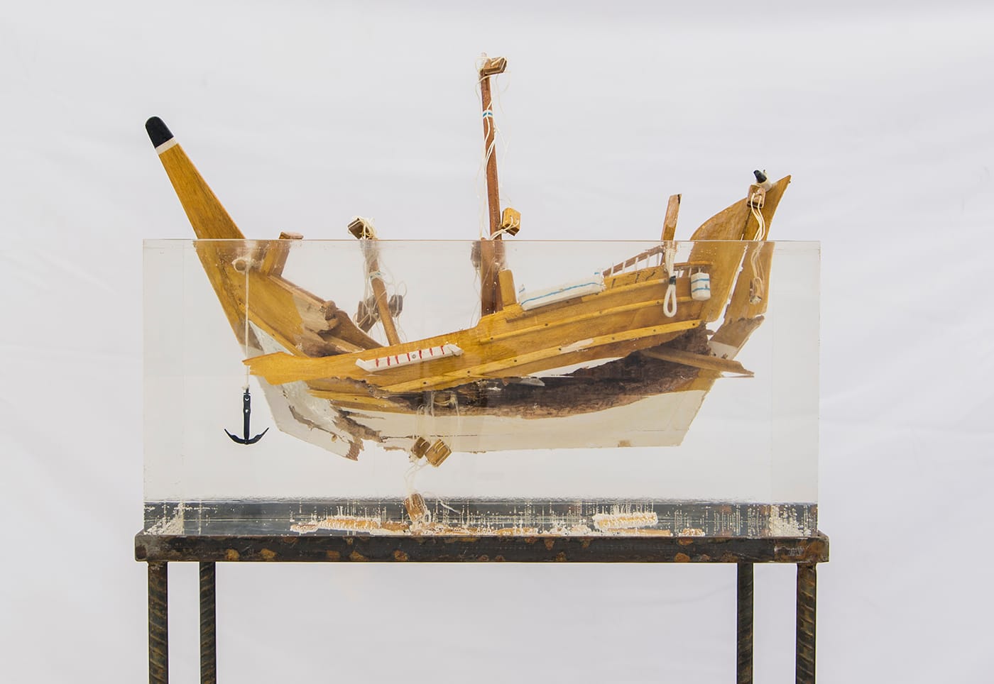‘Zineb Sedira: Air Affairs and Maritime Nonsense’ was a retrospective for the Paris-born artist who has been based in London since the mid-1980s. In photography and video, sculpture and installation, Sedira’s work has dealt with the experiences of migration and exile, often personal to the artist herself whose parents were Algerian immigrants in France. But she also engages with the broader framework: the forces of global capitalism and the colonial legacies that lead to the movement of people and goods. Boats have frequently been a metaphor in her work for the sea journeys migrants make. In “Sunken Stories” (2018), a new work produced especially for Sharjah, broken models of the small wooden dhows or sambuks that are still used for cargo journeys across the Arabian Sea, and have been for centuries, are fixed in clear resin blocks. The vulnerability and small-scale of the models echoing the actual boats, they hint at the journeys and lost lives of those who risk everything to attempt sea crossings in search of new lives. A sense of nostalgia, or perhaps it is more of a melancholy, can haunt many of Sedira’s filmic and photographic scenes: the melancholy of ruins, of decay, as in the photographs in “Haunted Houses” (2006). These images of abandoned colonial buildings built by the French during their occupation of Algeria, however, are emblems of the destructive nature of that colonial encounter and its particularly violent ending. The artist avoids any nostalgia, however, in two new installations: “Laughter in Hell” and “The Forgotten (Condemned) Journalists of Algeria’s Black Decade” (both 2018). The Black Decade, from roughly 1990–2000, is defined by the Algerian Civil War, with its estimated 200,000 deaths. Supported by SAF’s production program, the artist has researched and presented in a museum-style documentary exhibition the work of journalists and cartoonists in Algeria in those ten years, about 100 of whom were killed. The cartoonists’ humor was witty and ironic (and sometimes eerily contemporary), and the simple listing of names of those who died is sobering.