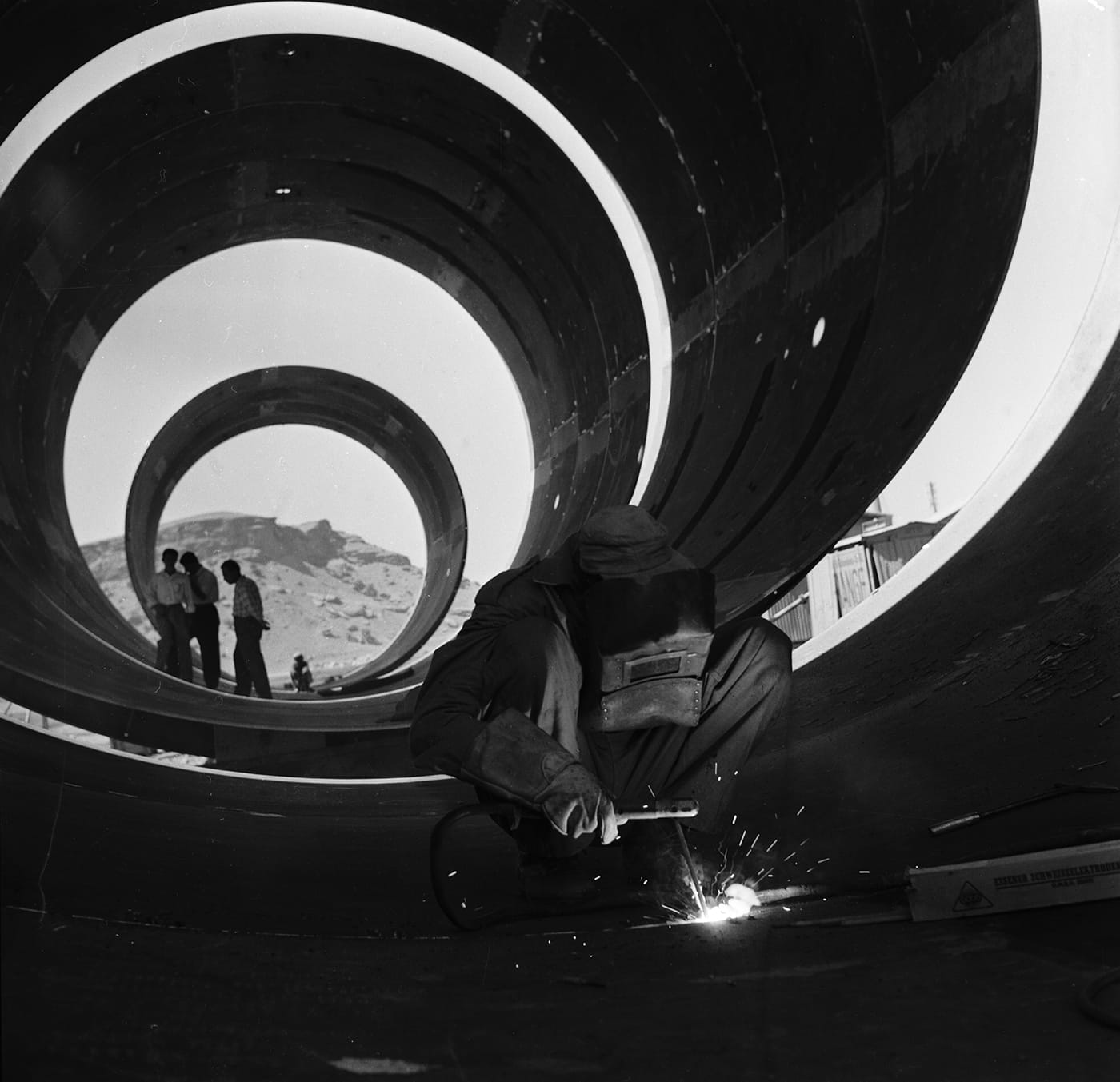 Iraqi photographer Latif Al Ani’s images from the 1950s through the 1970s record an era and place that has since seen troubled times. Born in Karbala, central Iraq, in 1932, Al Ani first picked up a camera in a local photographic studio and began working as a photographer for the then British-controlled Iraq Petroleum Company (IPC): “The IPC was a school for me in working seriously, having discipline, and order”, he has said. After the Arab Socialist Ba’ath party revolution in 1958, the IPC was nationalized and Al Ani moved on to found the photography department in the Ministry of Information (later Culture) in 1960. The Ministry published a magazine, New Iraq, in Arabic, Kurdish, English, French, and German, aimed at the diplomatic communities and international organizations working in Iraq. Al Ani travelled the country, photographing the ethnic diversity, traditions, and archaeological sites. In keeping with the government’s socialist agenda, he also documented the public parades and the modernization program, typified by his images of women working in factories, the dams and bridges, the new houses, offices, and apartment buildings.