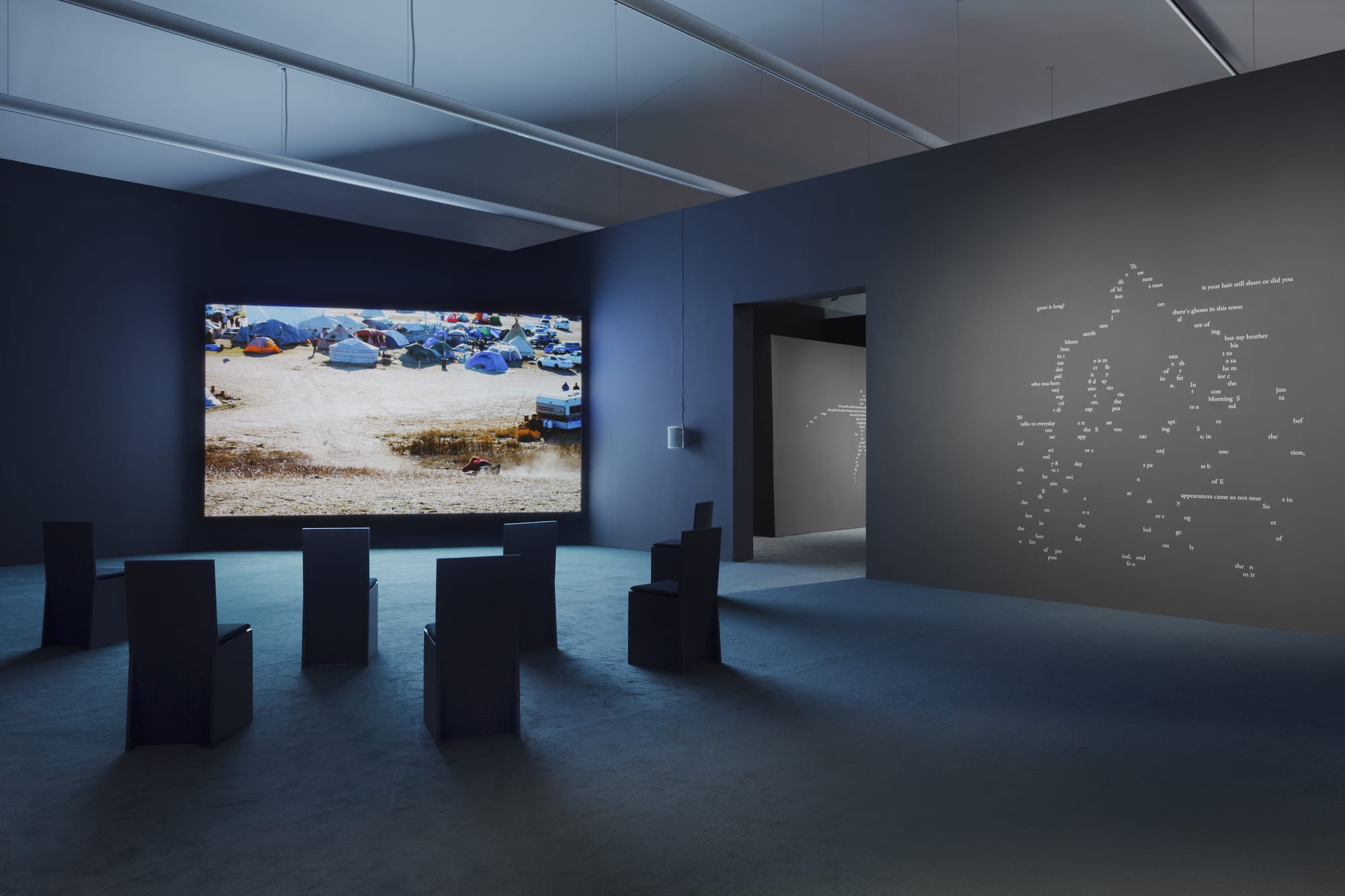 Centers of Somewhere largely emphasizes the role of language in Hopinka's work. Curator Lauren Cornell brings together three of the artist's earlier short films, along with Breathings, two wall calligrams, and the newly-commissioned Here you are before the trees, all dated 2020. Running through these works is a logic of wandering — a mode of making and moving that allows Hopinka to resist static ethnographic depictions of Native cultures and stretch beyond the manufactured diasporas of colonialism.