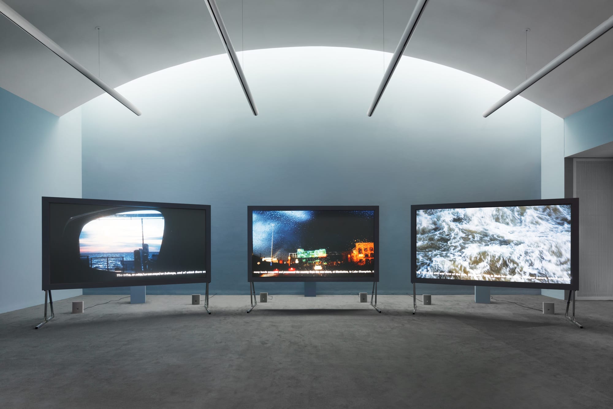 A similar sense of temporal disjuncture reappears in the multi-channel video installation, Here you are before the trees (2020) — the exhibition’s centerpiece — bringing the institution itself into the larger narrative of Indigenous sovereignty and disenfranchisement. Bard stands on the tribal homelands of the Munsee and Mohican peoples, who in the early 19th Century were forcibly relocated to reservations in northeast Wisconsin, adjacent to the Ho-Chunk homeland. For Hopinka, who teaches film and electronic arts at Bard College, these stories of simultaneous displacement and survival — which connect the Stockbridge-Munsee to the Ho-Chunk, forced from Wisconsin to Nebraska — are embodied and personal. Against footage of the sun setting over the Mahicannituck (the Hudson River, near Hopinka's current home), rolling streams in the Waaziija (the lands of the Ho-Chunk Nation, the artist's tribal homelands), and his travel along highways linking the two, Hopinka superimposes the transcription of an 1854 speech by John Wannuaucon Quinney and audio recordings of authors Vine Deloria Jr. and Adrian C. Louis. This complex layering of voices and temporalities addresses the ongoing structural violences of land appropriation, while destabilizing static colonial perspectives about place, personhood, and language.