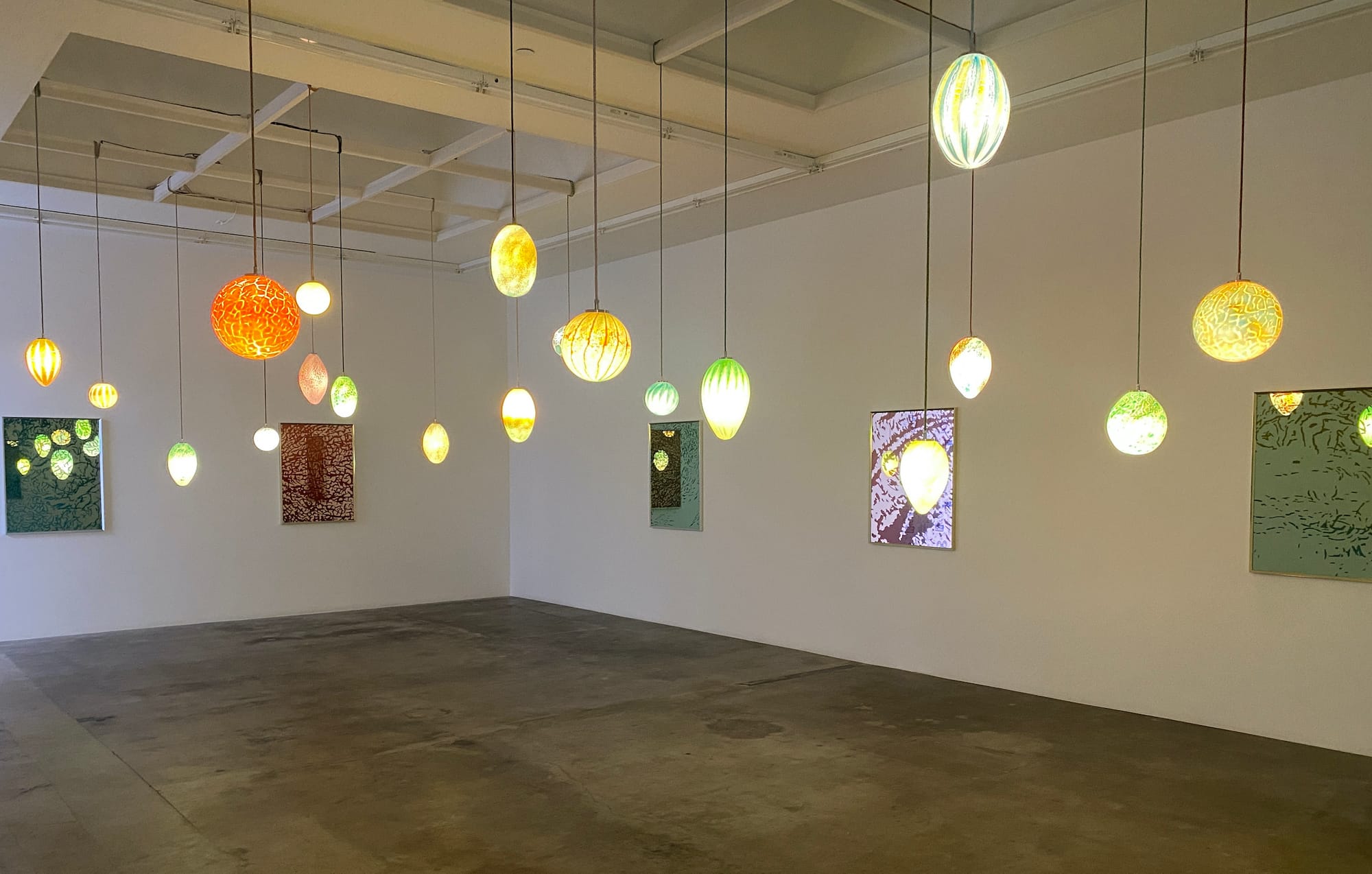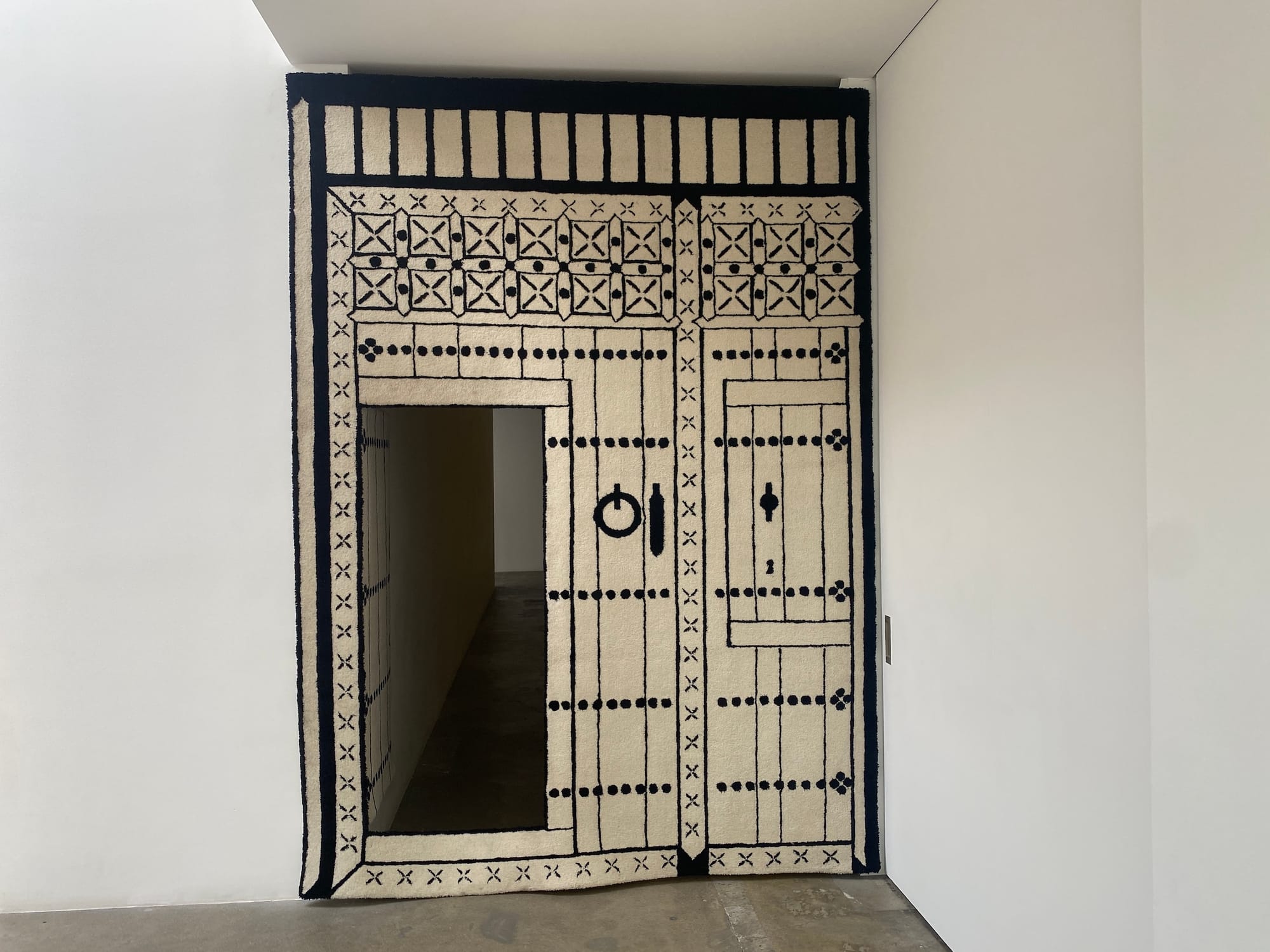 LOS ANGELES — There’s a meditative quality to Slavs and Tatars: Hang Don’t Cut, on view at Tanya Bonakdar Gallery through September 9. Step through “Soft Power” (2023), a carpeted black and white doorway, and you’ll find an array of blown glass lamps. They look like melons (in Slavic etymology, “melon” and “to blow” are close kin), and they glow hauntingly in the dark room.