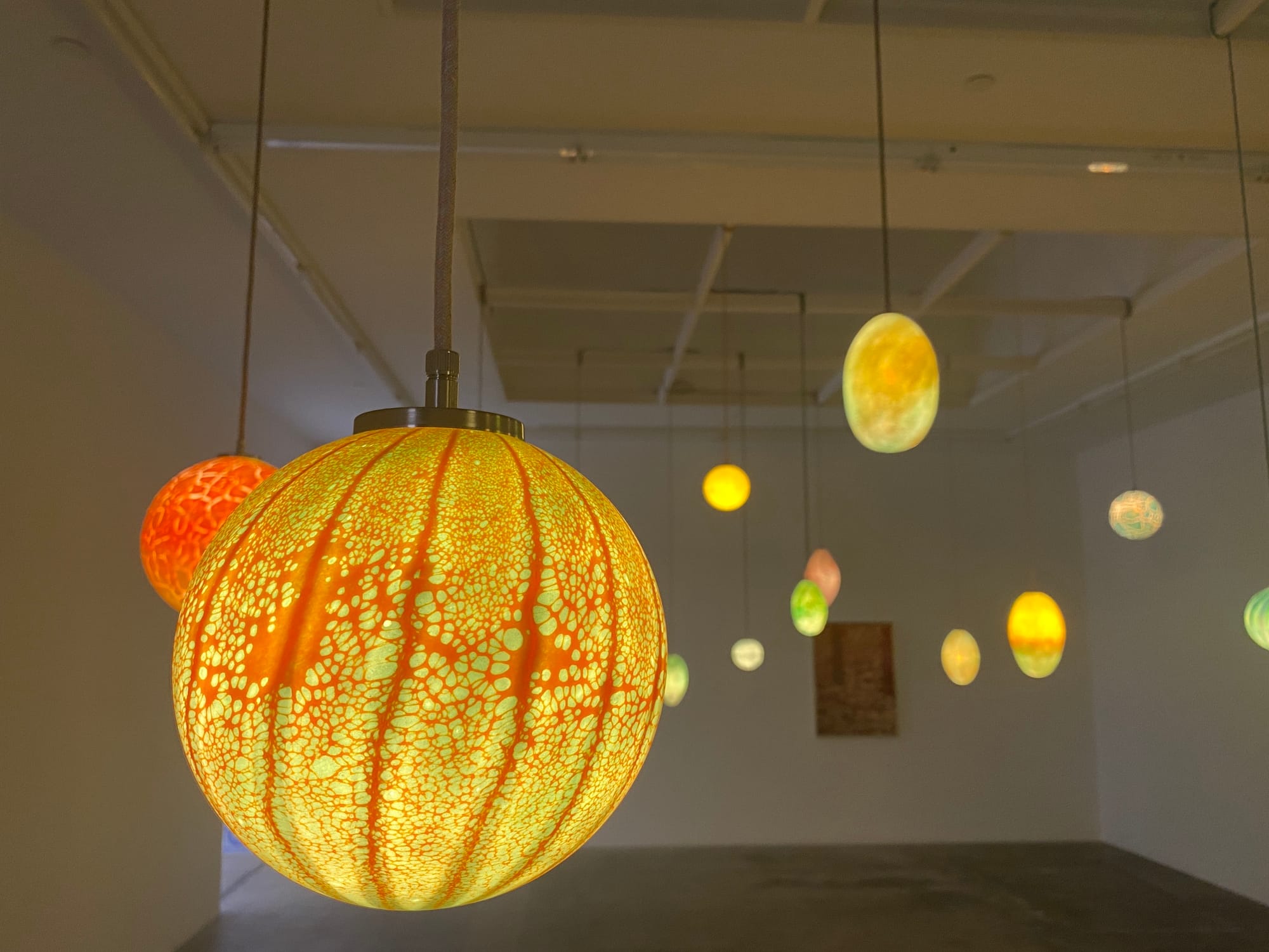 Walking around the lamps and mirrors, I thought as much about the stars as I did the Earth. The lamps look like far-off planets, floating through the galaxies that the mirrors create. The rug’s prayerful hands point upward, but they are clearly weathered by the Earth. Knowledge, it seems, sits in between Heaven and Earth. If books and literature help us make sense of the world, we can consume all we want, but like the melons of legend, they offer only glimpses.