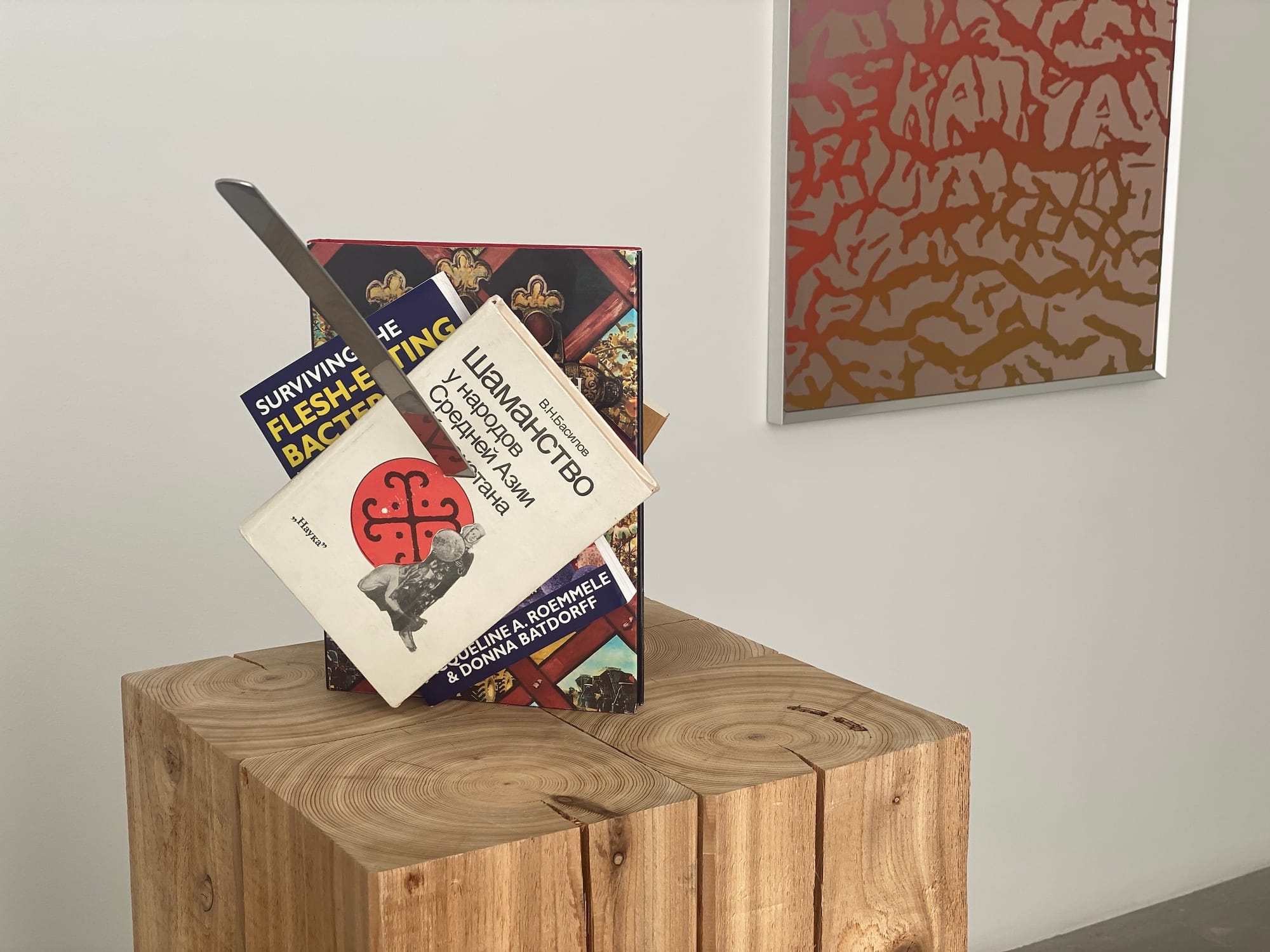 Knowledge and literacy in their many forms are at the heart of this small but rich show. One sculptural work, “Kitab Kebab” (2016), features books skewered together. “Kitab” means “book” in a variety of languages spoken in Eurasia, and the selection references the affective role of knowledge, not to mention the way learning cuts across various books and modes of study.