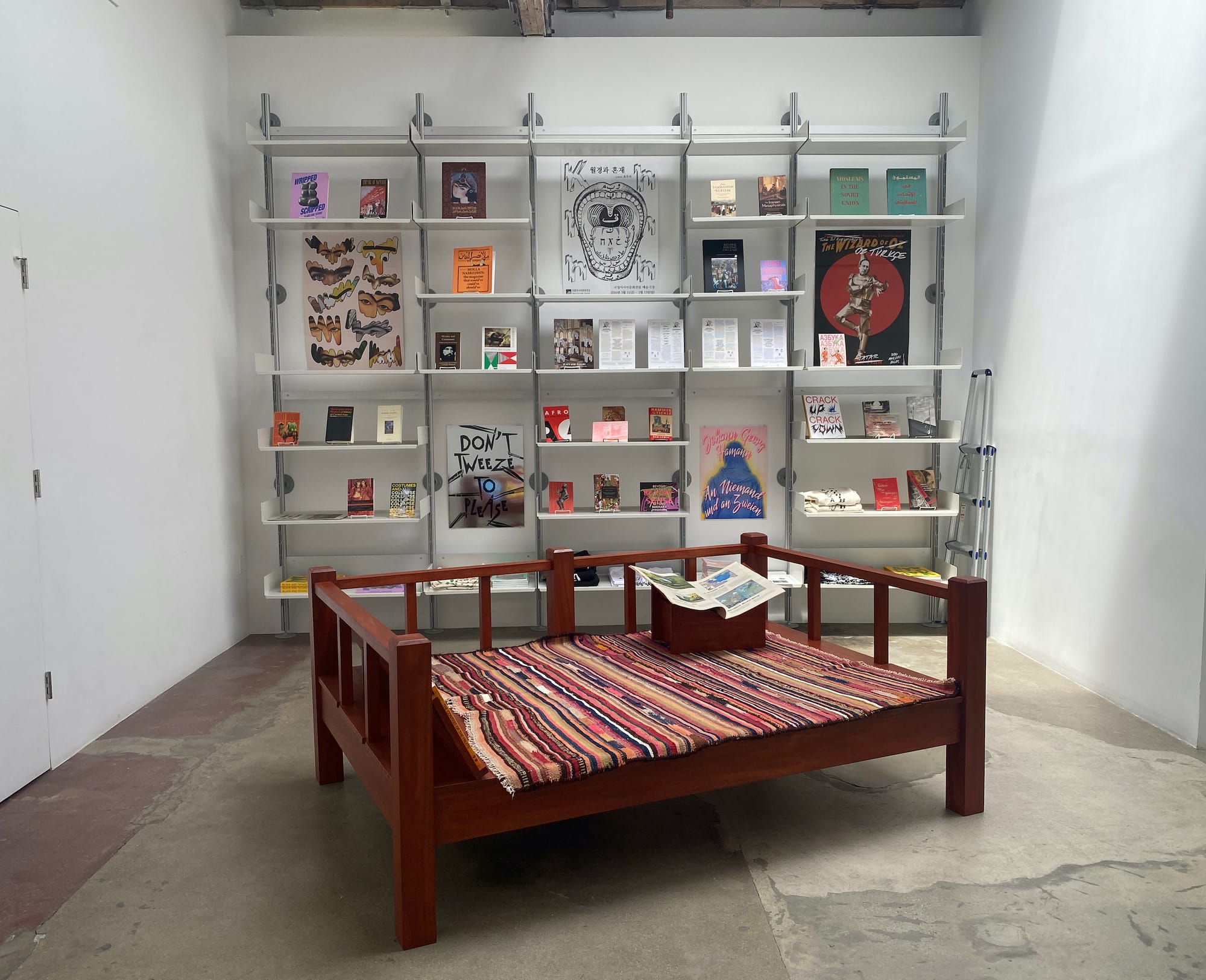 “Underage Page,” a wall installation in a larger gallery space, incorporates a reading area that requires the reader to sit facing a wall, almost kneeling as if in penitence. In the same room is a yarn rug called “W-RK H-RD PR-Y H-RD” (2023), depicting hands in prayer.