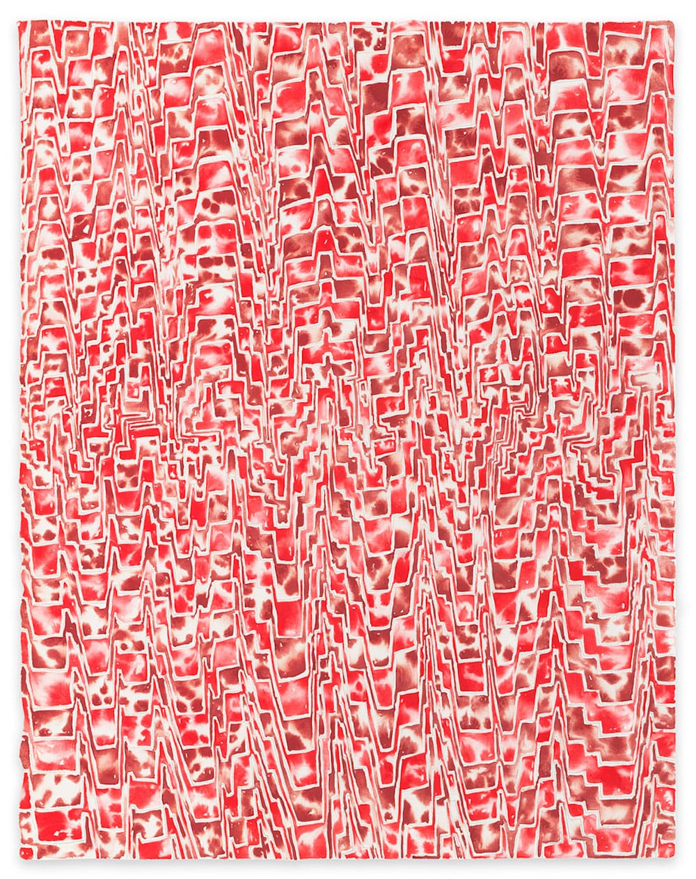 In an interview with Noelle Bodick (Artspace, February 25, 2014), Siena cited the late work of Sol LeWitt as an influence, “where his grids appear to sag under the weight of gravity.” The slipping and shifting lines and color variation animate the drawings, creating the sense that they are moving and in a state of change. The drawings are not symmetrical and there are no patterns in which a design is repeatedly replicated. There is only constant change and difference. While the drawings might bring to mind a reflection seen in moving water — an image on the brink of reformulation — that association quickly passes. The territory in which Siena works is bordered by the wildness of Jackson Pollock and the rule-bound control of LeWitt.