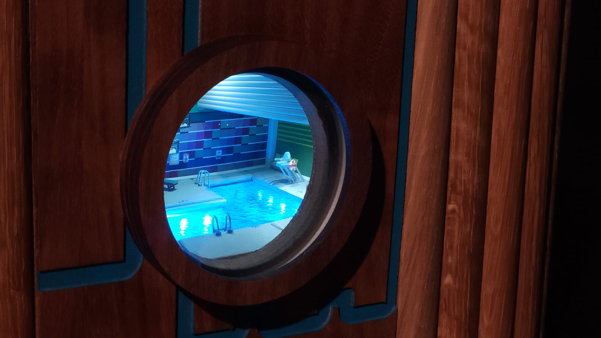 The basement floor of the exhibition hosts more of the miniature dioramas and environments that employ flocking powder, 1:12 scale furniture, and exact measurements. Most of the dioramas can be sorted into hyperrealism or fantasy, but Margie Criner's works sit somewhere between the two. Three wooden mid-century modern "vessels" have lens-like windows showcasing different interiors that Criner handcrafted as a textile and graphic designer as well as a woodworker. From a dismal-looking apartment living room to an indoor community pool, Criner selects from and expands on moments from her life for viewers to toy with and project their own experiences onto.