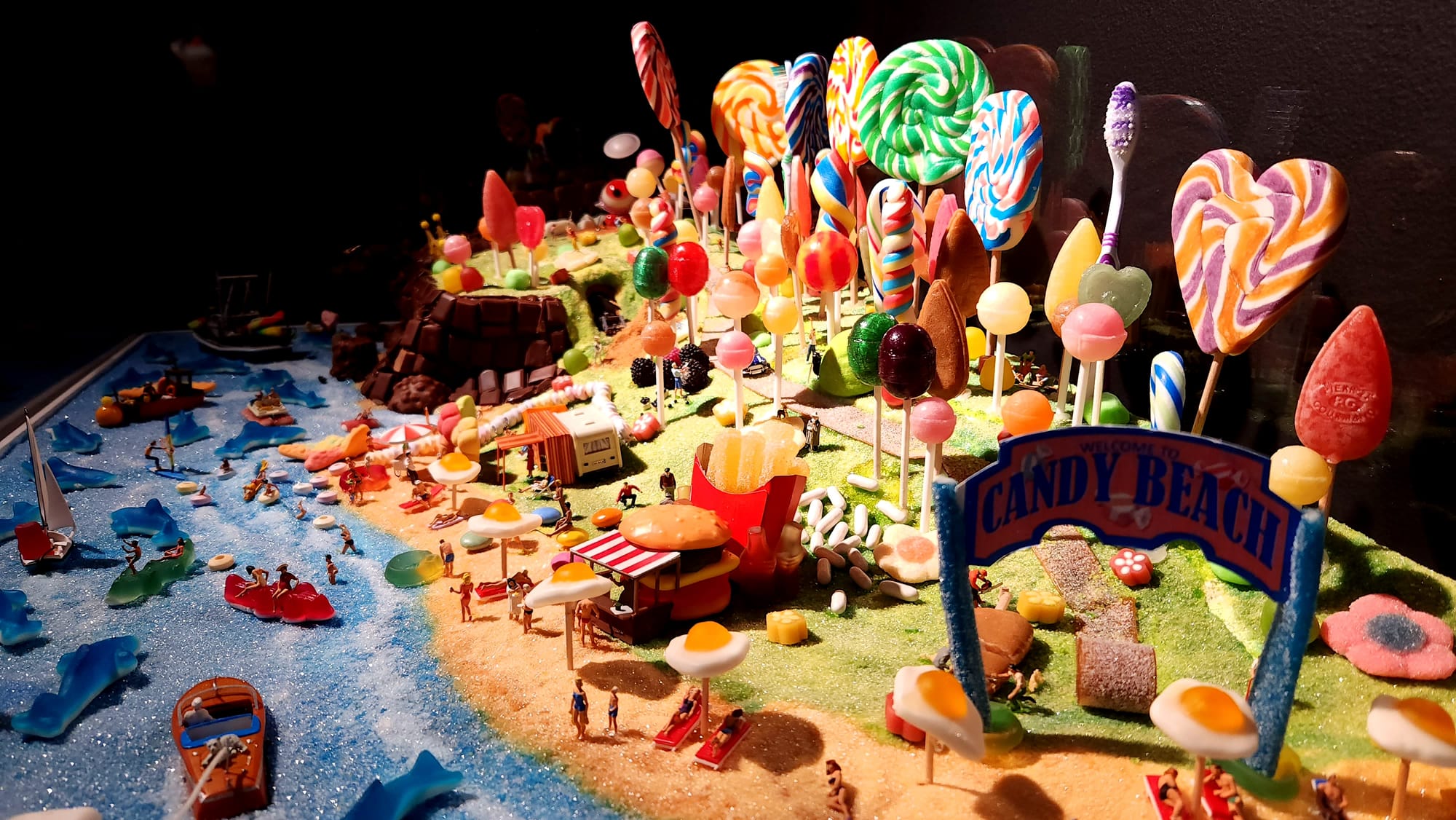 In the dimly lit space, dark walls prevent reflections on the vitrines that encase elaborate and clever scenes: The first section, titled Tiny is Funny, exposes the childish whimsy of miniature art through Lego characters and faceless model figures playfully arranged in outrageous, supremely photogenic situations. Akiko Ida and Pierre Javelle, better known as the art pair Minimiam, curate prop-specific scenes such as miniature people inflating raisins back into grapes, painting white splotches onto mushrooms, and merrymaking on a beachside made up entirely of candy and gummies.