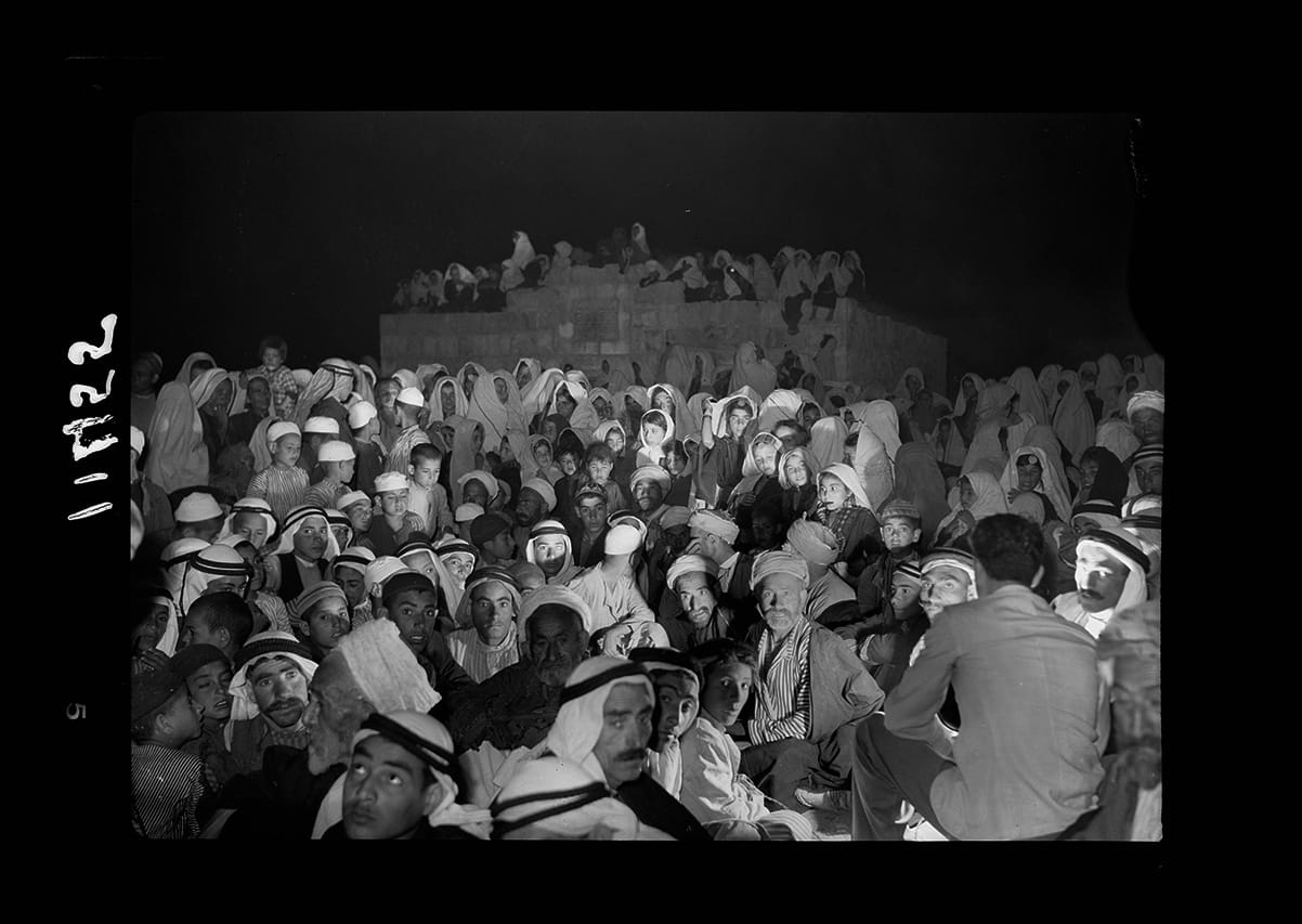 Still, my favorite image, of an open-air cinema in the city of Halhul near al-Khalil (Hebron), taken in 1940, reminds me how special it is to see a crowd of Palestinians huddled together on the ground to watch a film projected onto a mosque’s outer wall. I am moved by every face illuminated by the film's light to contrast the night. This, a leisure activity, invites us to witness.