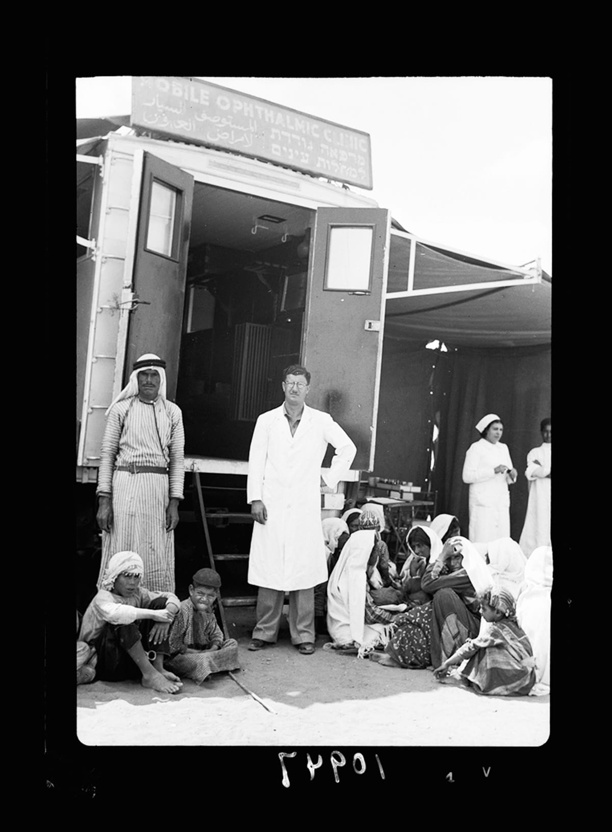 The majority of the images are paired in spreads of four, with some accompanying text in English and Arabic describing the photographs or providing historical context. I am struck by the range of emotions captured, from the ease of women smoking together to snapshots of the Palestine Broadcasting Service studio in Jerusalem. As hospitals continue to be targeted by Israeli bombardment, the photos of patients in front of a mobile eye clinic in northern Gaza in 1939 feel particularly tender. Children sit, squinting into the sun, with nurses chatting in the background. The mundanity of Palestinian society before the Nakba becomes a gift in these images, filled with all of the usual activities that are easily taken for granted — people spending time with loved ones, going to and from their jobs, harvesting their fields.