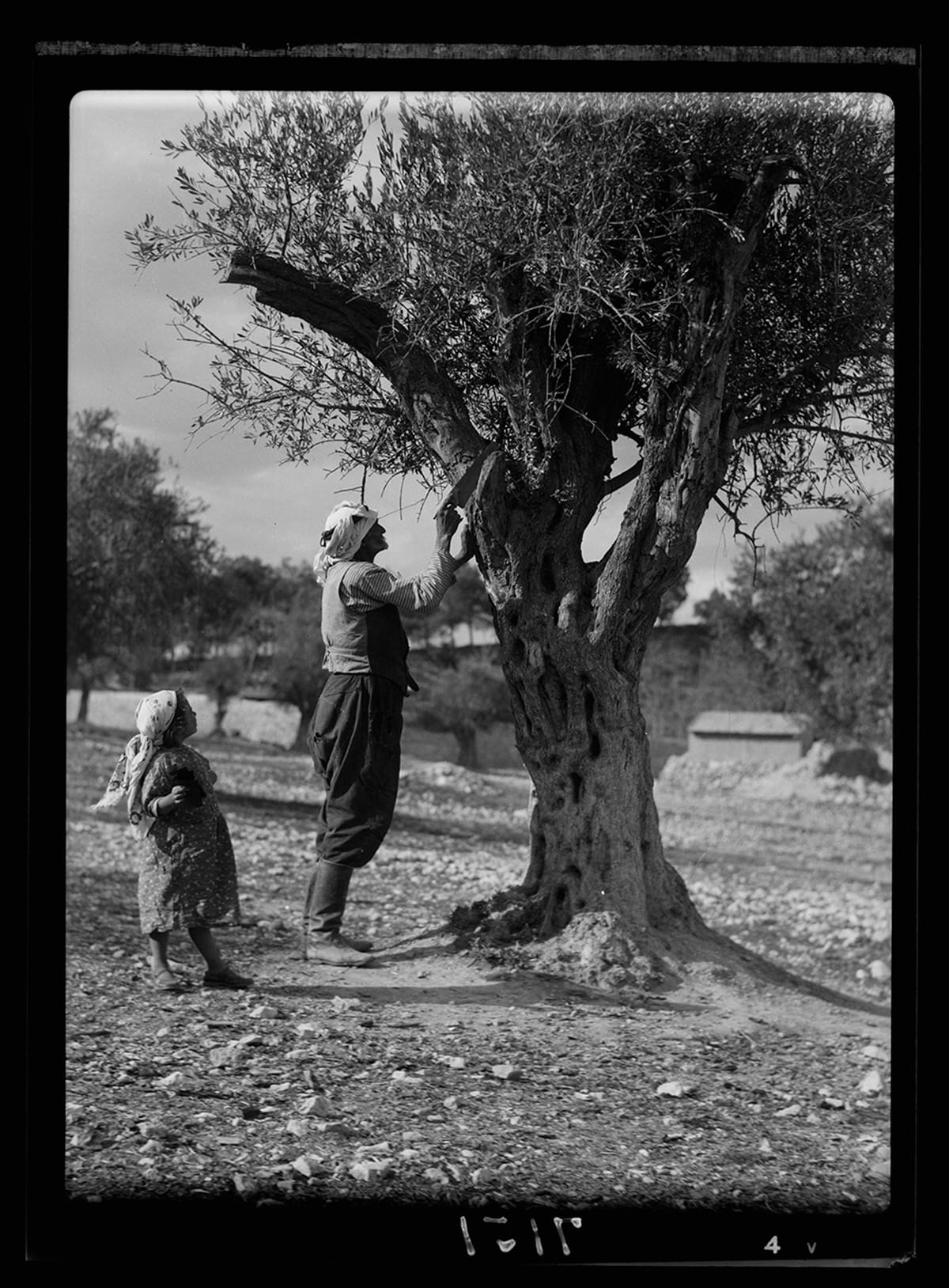 The first photographs we see in the book depict olive cultivation. On the left, a photo from 1934–39 shows a man pruning trees with a child by his side, his head angled gently upward as he handles the olives. In an image to its right from 1900–1920, a group of women and children sit on dusty ground pressing olives, the next step in the process of harvesting the oil.