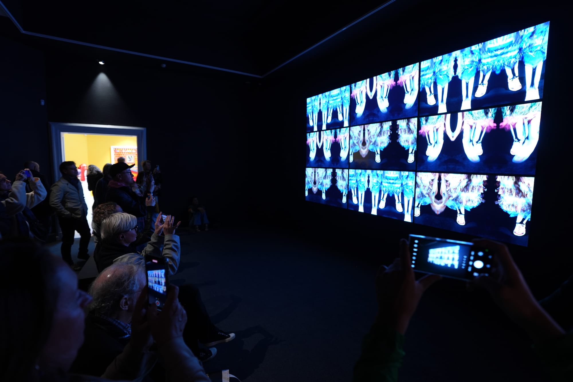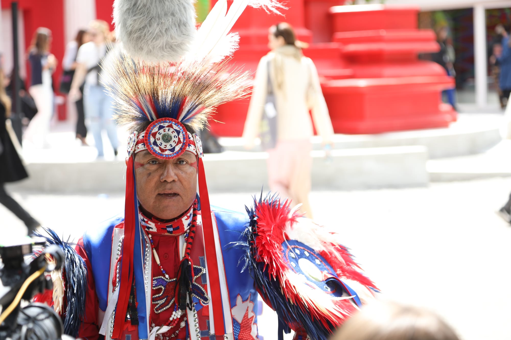 Jeffrey Gibson's "I’M A NATURAL MAN" (2024) (left) and "Treat me Right" (2024) (right), glass beads, nylon thread and fringe, vintage pinback buttons, tin jingles, metal bells, plastic bone pipe beads, grosgrain ribbon, acrylic felt, cold-rolled mild steel, steel plate, marble base, 23 x 24 x 12 inches and 29 x 26 x 16 inchesJeffrey Gibson, "She Never Dances Alone" (2020), nine-channel video installation featuring Sarah Ortegon; soundtrack: "Sisters" (2013) by The Halluci Nation featuring Northern Voice, two minutes and 50 secondsJeffrey Gibson, "if there is no struggle there is no progress" (2024), glass beads, rose quartz, metallic sequins, nylon thread, acrylic felt, polyester fill, cold-rolled mild steel, 23 x 35 x 18 inchesJeffrey Gibson, "Be Some Body" (2024), glass beads, nylon thread, vintage pinback buttons, tin jingles, acrylic felt, cold-rolled mild steel, steel plate, marble base, 23 x 24 x 12 inchesInstallation view of US Pavilion interior featuring Jeffrey Gibson's "ACTION NOW ACTION IS ELOQUENCE" (2024) and "Be Some Body" (2024)Installation view of US Pavilion with works by Jeffrey GibsonA performance during the US pavilion's press preview (photo Avedis Hadjian/Hyperallergic)One of the performers at the US pavilion (photo Avedis Hadjian/Hyperallergic)Exterior of the US Pavilion with murals and central sculpture by Jeffrey Gibson