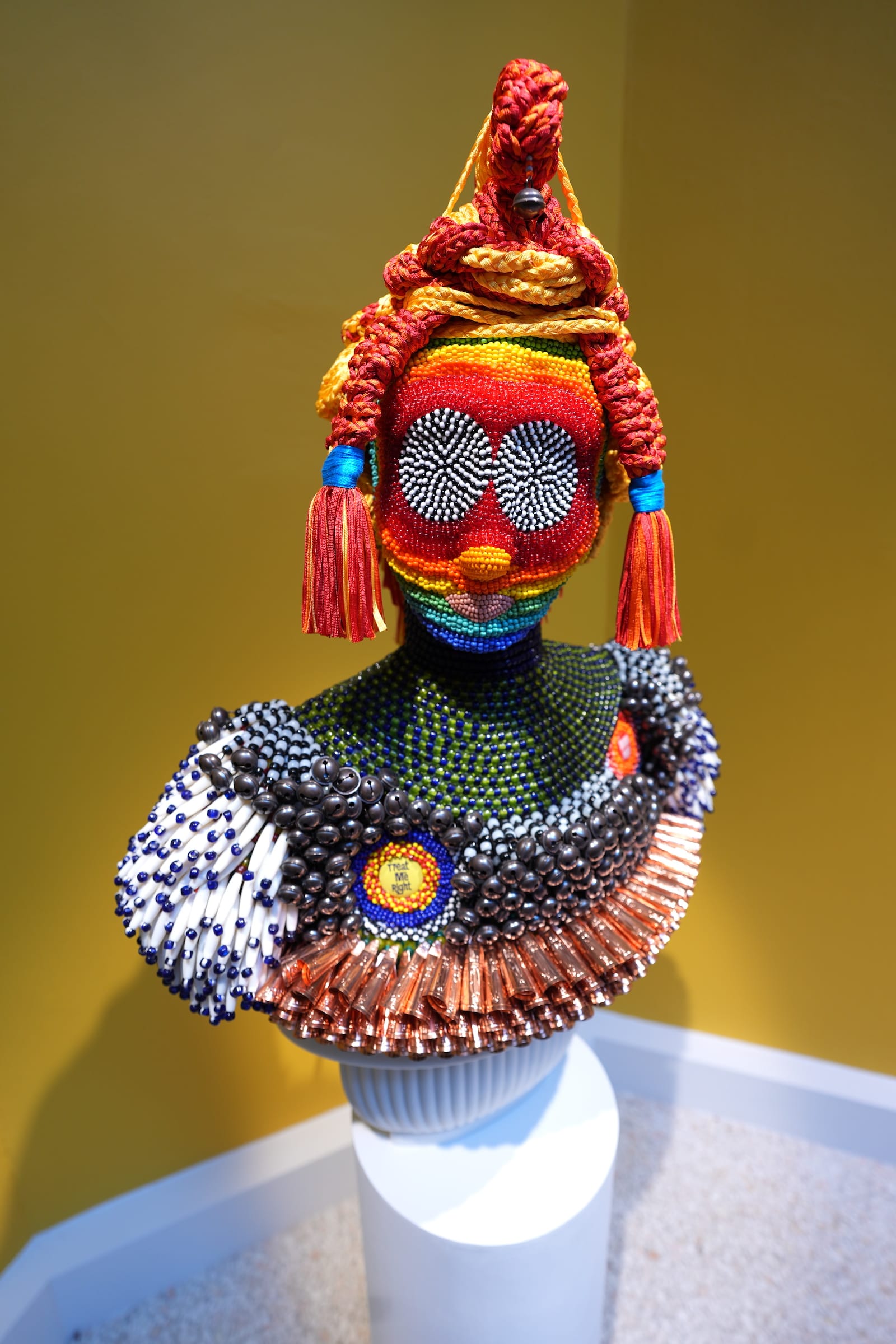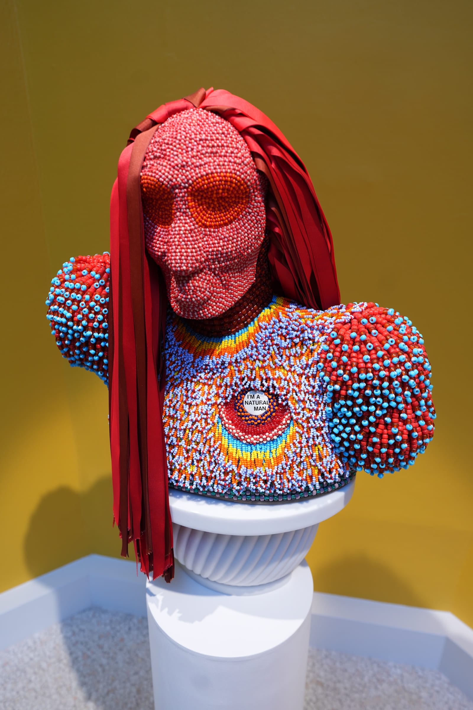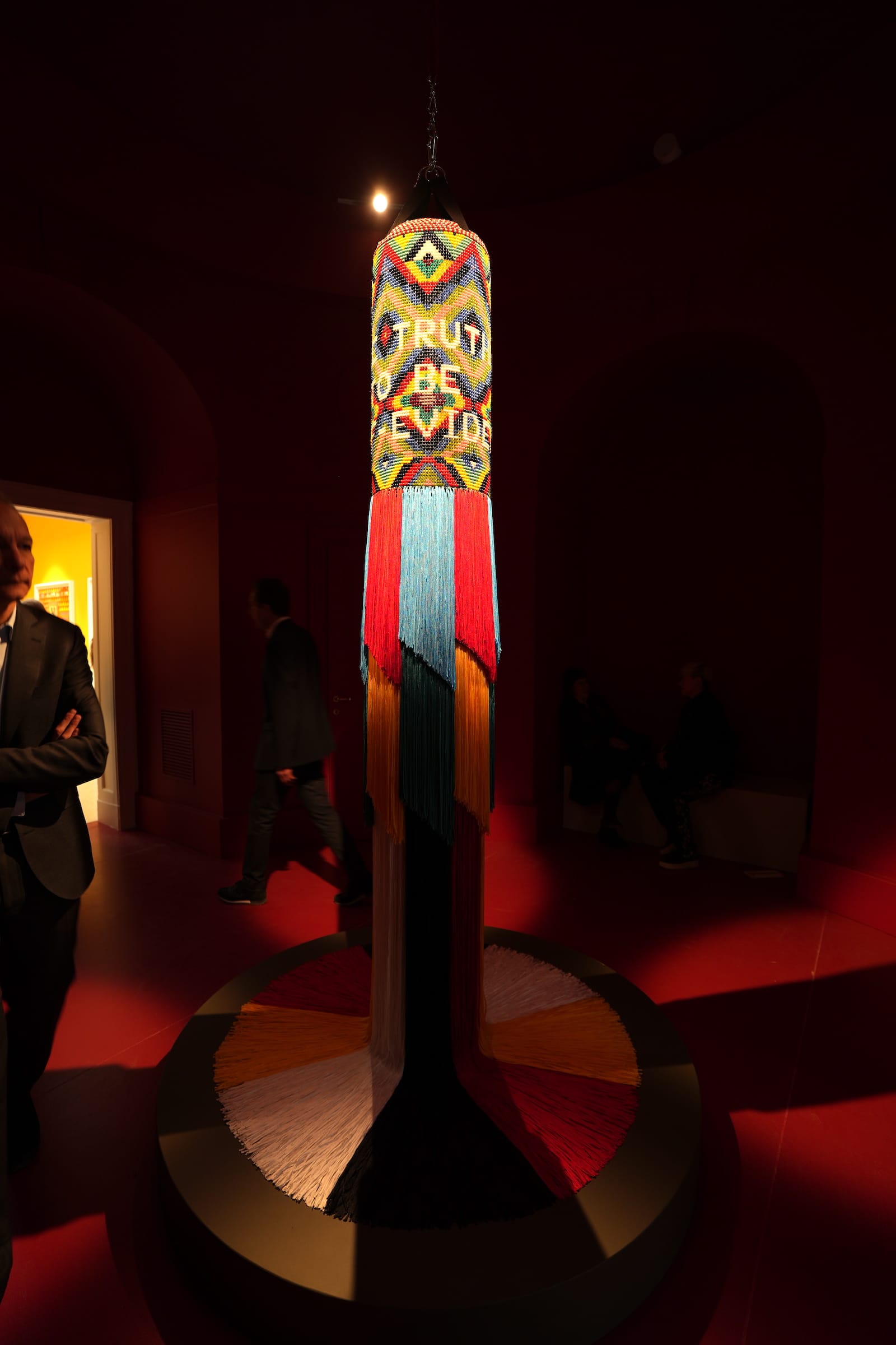 A monumental bright-red sculpture of stepped pedestals against a geometric backdrop and flags mounted on teepee poles graces the entrance, where visitors can appreciate the Cherokee and Choctaw artist’s hybrid visual lexicon of Native and queer iconographies. On preview day, performers enacted a traditional jingle dress dance atop the podium-like structure, which visitors are now invited to climb and activate. Inside, beadwork sculptures that impress us with their technical intricacy take on a tone of subversion through the inclusion of language drawn from US founding documents, materials that represent at once promise and failure.