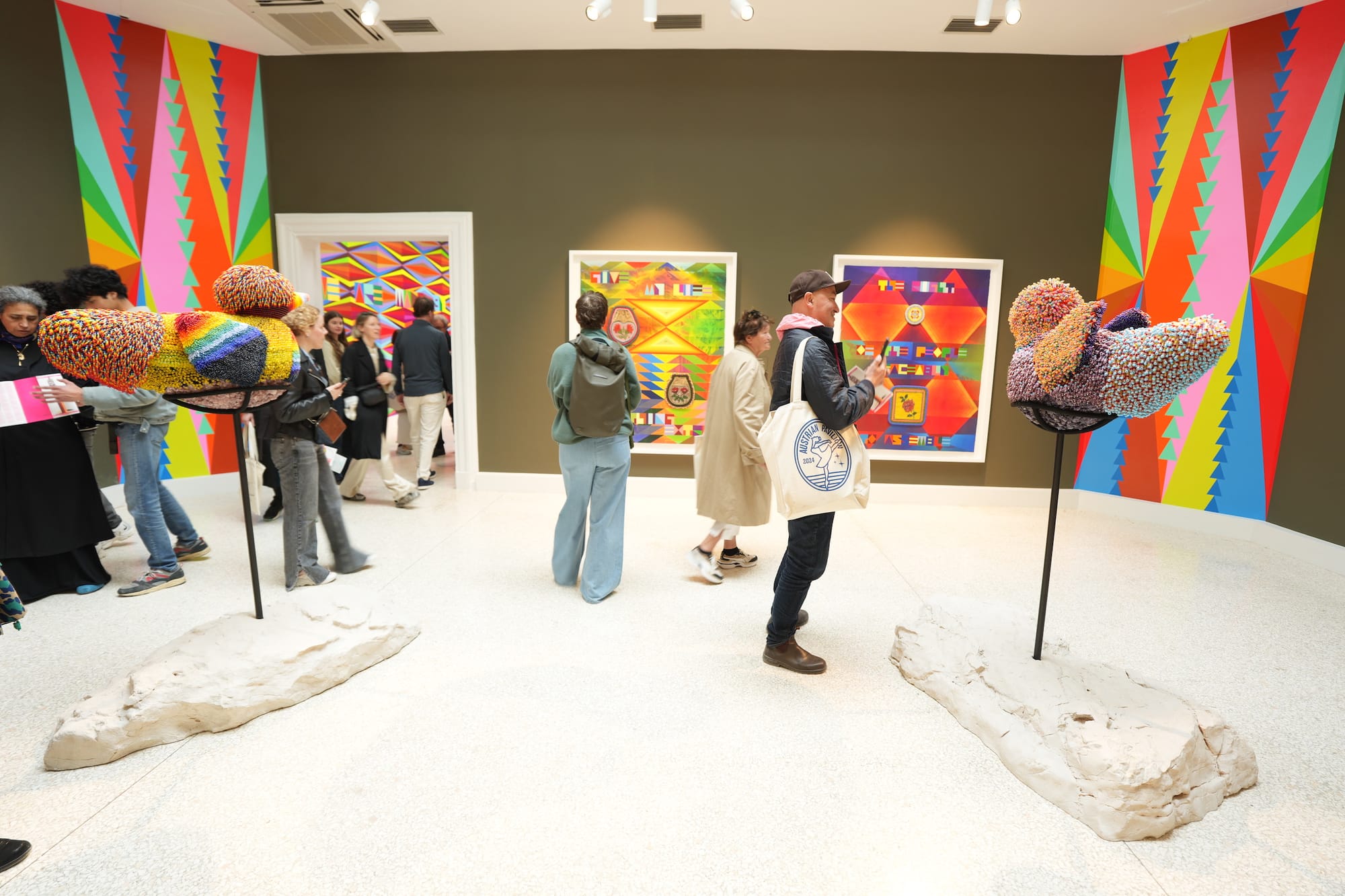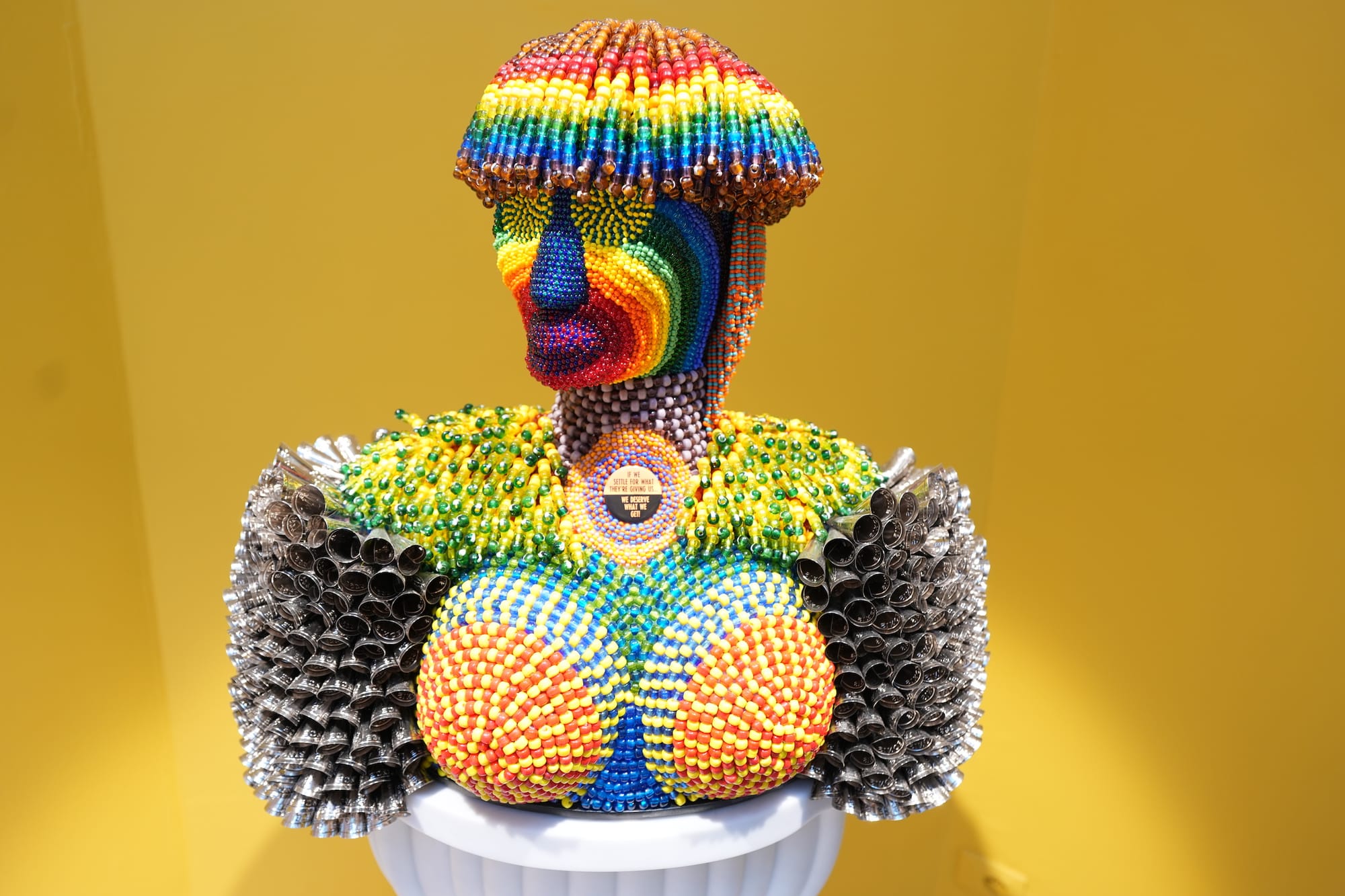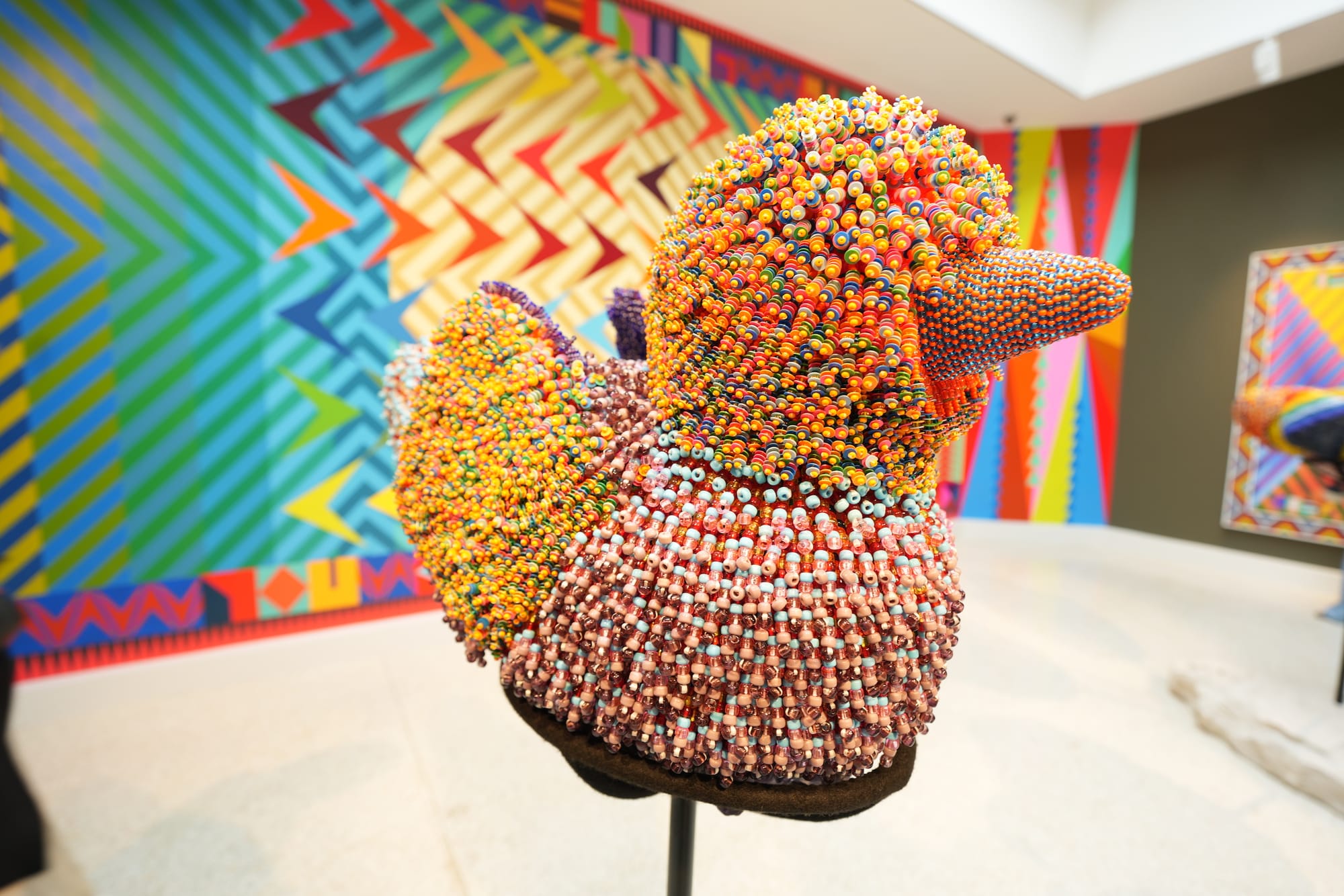 A monumental bright-red sculpture of stepped pedestals against a geometric backdrop and flags mounted on teepee poles graces the entrance, where visitors can appreciate the Cherokee and Choctaw artist’s hybrid visual lexicon of Native and queer iconographies. On preview day, performers enacted a traditional jingle dress dance atop the podium-like structure, which visitors are now invited to climb and activate. Inside, beadwork sculptures that impress us with their technical intricacy take on a tone of subversion through the inclusion of language drawn from US founding documents, materials that represent at once promise and failure.