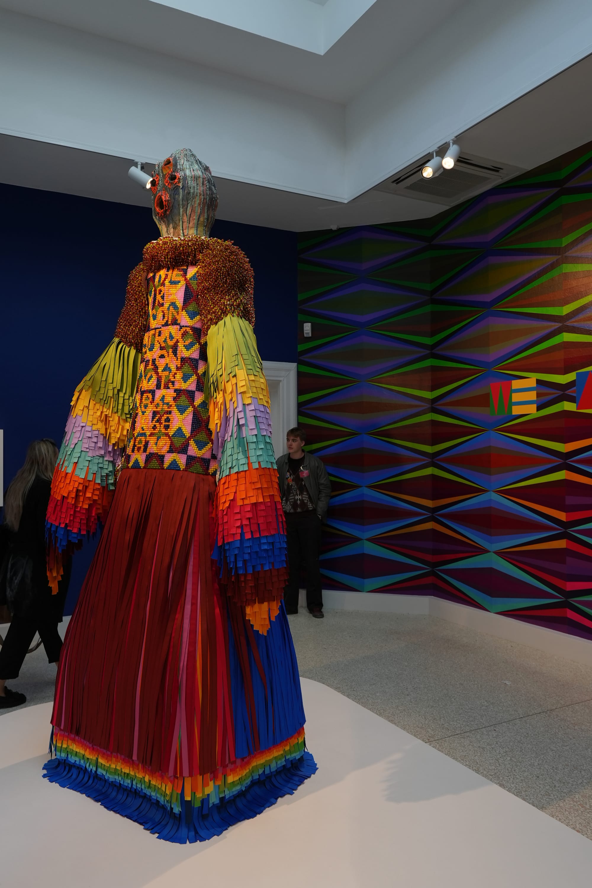 Jeffrey Gibson, "We Want to Be Free" (2024), ceramic, glass beads, plastic beads, nylon fringe, tin jingles, nylon thread, canvas, acrylic felt, cold-rolled mild steel, steel plate, 108 x 42 x 42 inchesJeffrey Gibson, "The Space in Which to Place Me" 2024, interactive sculpture made of concrete, paint, fiberglass, polystyrene foam, and steel, 10 feet x 18 feet 4 inches x 17 feet 7 3/4 inchesInstallation view of US Pavilion interior featuring Jeffrey Gibson's sculpture "if there is no struggle there is no progress" (2024) and mural "BIRDS FLYING HIGH YOU KNOW HOW I FEEL" (2024)