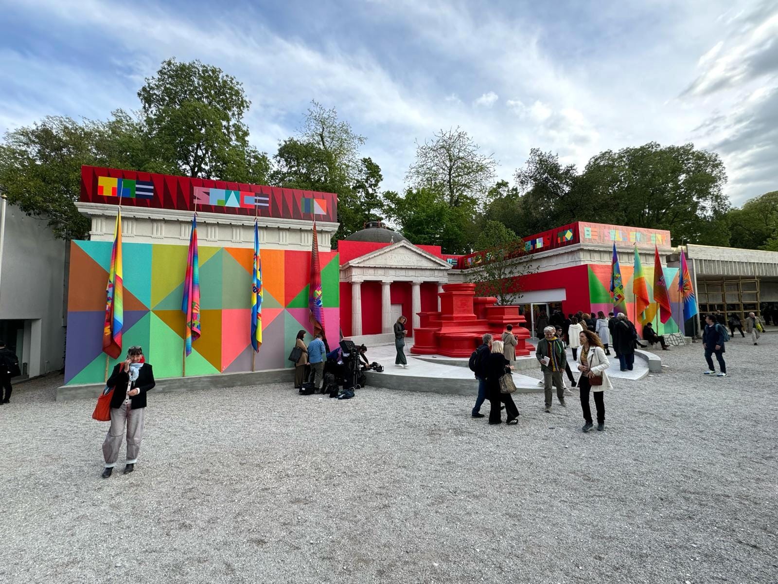 Exterior of the United States Pavilion exhibition The space in which to place me with works by Jeffrey Gibson (all photos Hrag Vartanian/Hyperallergic unless otherwise noted)