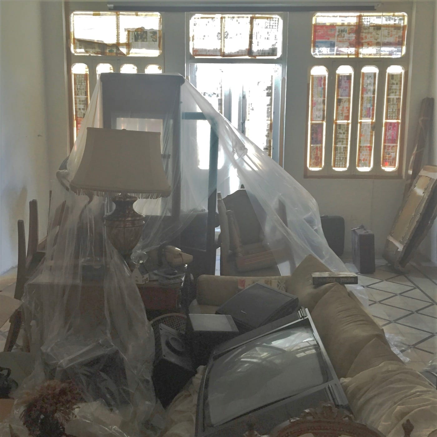 BEIRUT — As the Sunday evening sun set on the 13th edition of the Sharjah Biennial, Tamawuj, elbow room became scarce on the third floor of a well-worn stately home in Beirut’s Sanayeh neighbourhood. A large number of visitors navigated around a jumble of personal effects piled high and wide in the center of the room — all the furniture of a 1970s parlor condensed into a singular mass, draped with dusty plastic sheets. It seemed as though the room had been prepped for a paint job about four decades ago, and the residents simply forgot to move back in.