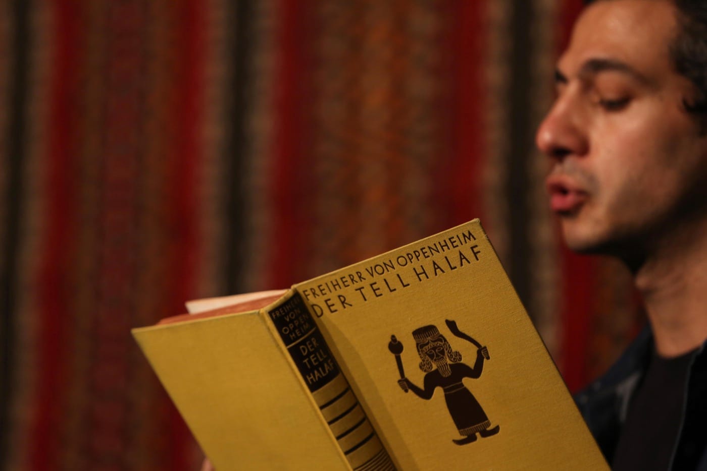 Some of these events were presented as lectures: Ho Rui An’s “DASH” (2016) began with ruminations on the dissemination of (and obsession with) serious car accident footage via dashcams, which expanded to scan the Singapore government’s crisis-prediction apparatus. Others, like Rayyane Tabet’s “Dear Victoria” (2016–ongoing) were part-reading, part-performance, in which a family history is intertwined with that of Max von Oppenheim and his early 20th-century excavation of Tell Halaf, a Syrian archaeological site. As Tabet describes the individual fates of the area’s reliefs (some back and forth across a divided Berlin, some in the Met, others unknown), we also learn about his great-grandfather, who was enlisted as a translator/spy by the French to report on von Oppenheim’s operations. As Tell Halaf’s cultural heritage is dissected and destroyed, the backdrop chosen by Tabet takes on special significance: sections of a family rug, an heirloom divided into smaller pieces and passed down to successive generations.