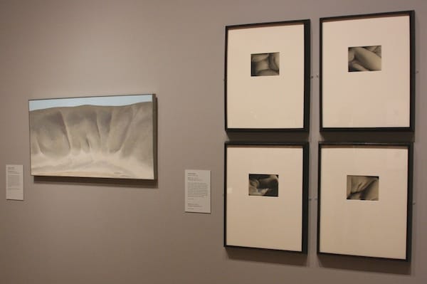 It also helps that the work on display in Modernist Photography is just about the opposite of what you’d expect from such a dry title. These are fleshy works, portraits that pin down the wrinkles of a face, nudes that trace the contours of skin and volumes of the body. The mechanical aesthetic that formed another wellspring of the modernist aesthetic is largely submerged for a more intimate, physical collection of work. Close observation is still the name of the game, as it is with Stieglitz’s vertiginous photos of New York City skyscrapers and O’Keeffe’s paintings of the same, but here, the subject that most entranced these artists was themselves, and we’re all better off for it. Nowhere is the messy give and take of an art movement more apparent than in the striking juxtaposition (seen above) of an O’Keeffe canvas with a grid of Charles Sheeler drawings. O’Keeffe’s dusky mountains have the same wrinkles, folds and mass of Sheeler’s sketches, traced from the artist’s own close-up photos of the landscape of his wife’s curves.