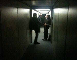 As the Outpost opening wound down, the crowd headed down Norman Street to the second extant art space of the burgeoning Bushwood (Bushwick + Ridgewood, get it?) art neighborhood and checked Andrew Ohanesian’s new installation “Untitled (The Jetway)” (2010) at Famous Accountants, a gallery only accessible (not to mention visible) as a staircase leading underground. Dismounting the stairs, a long hallway met us visitors. But didn’t the hallway look familiar? Kind of like that thing that gets you on to an airplane? It took another trip through, but eventually we were hanging out in Ohanesian’s installation, discussing the reactivation of space and the peculiar feeling of displacement redolent of airports. Consider the exhibition a success, and it got even better upon reaching the building’s backyard at the other end of the Jetway and the treasure trove of cheap beer.