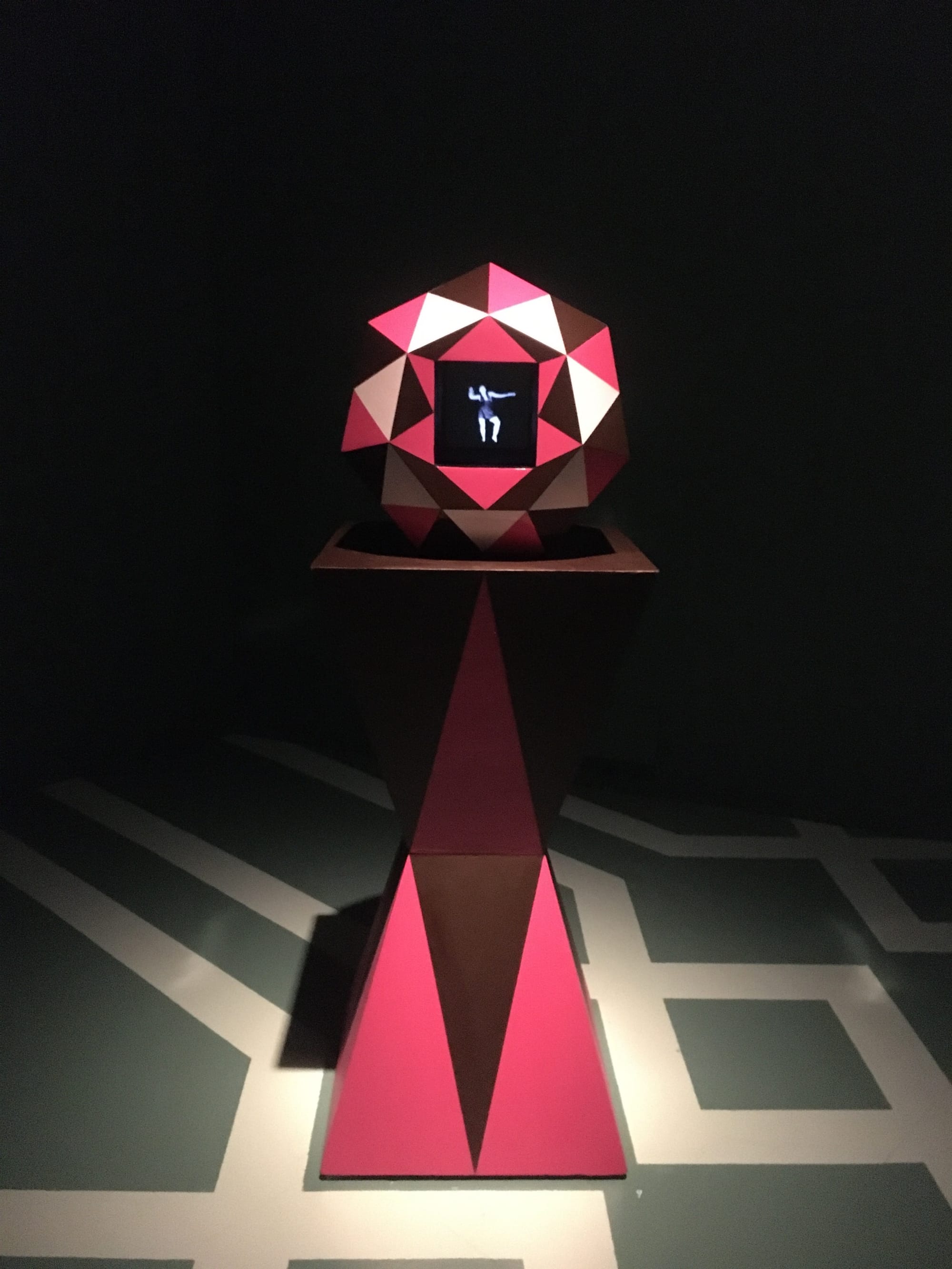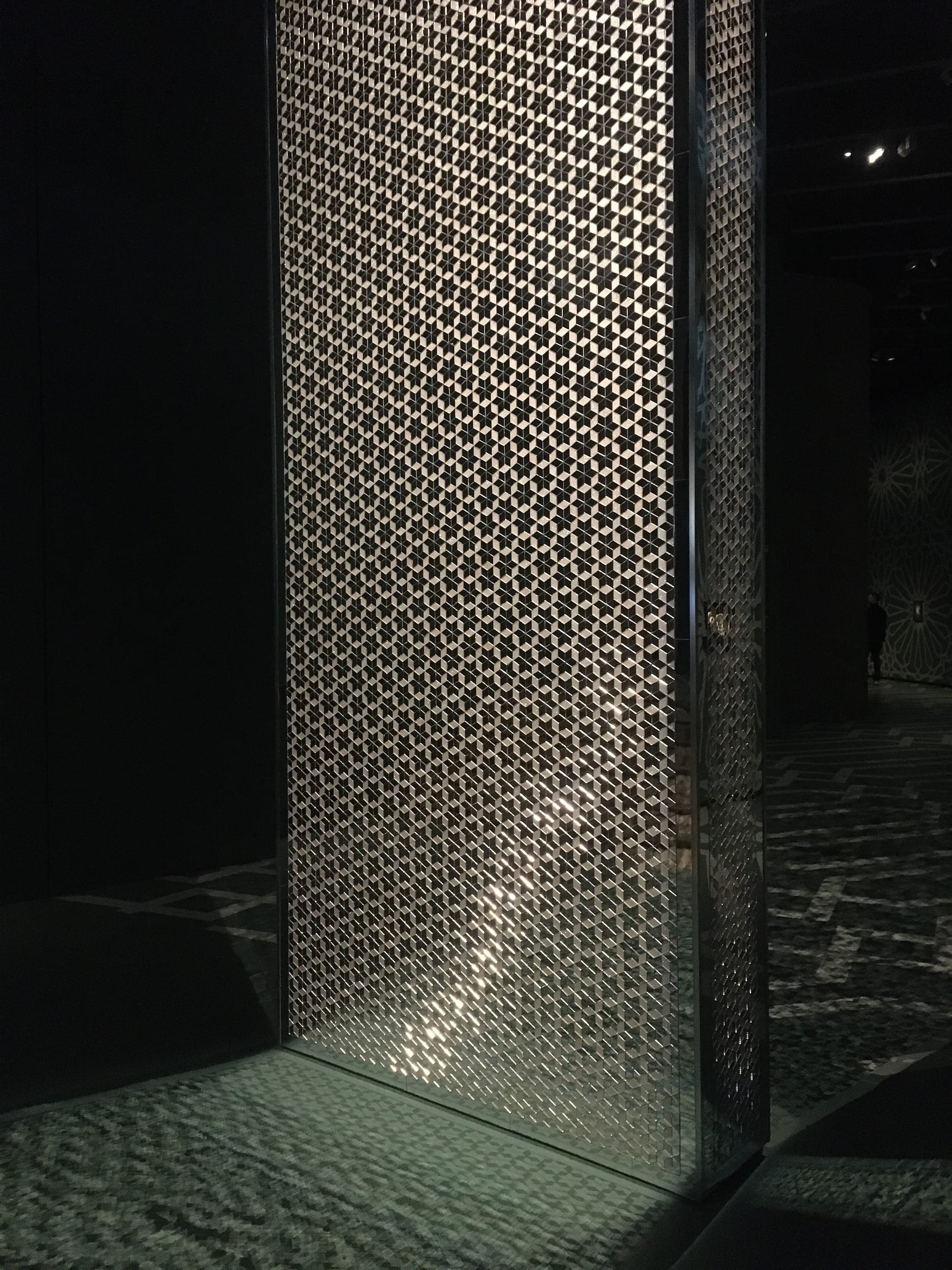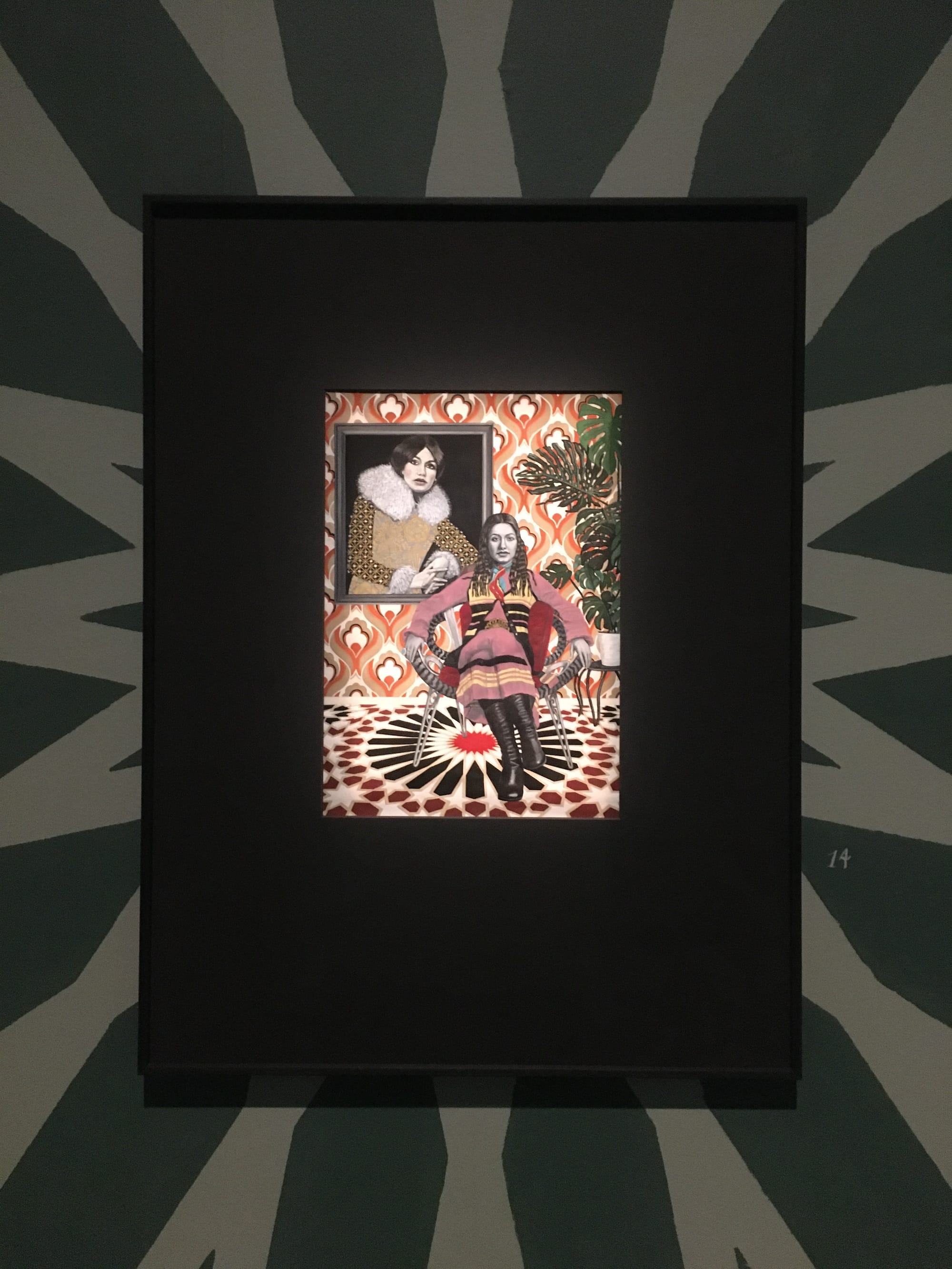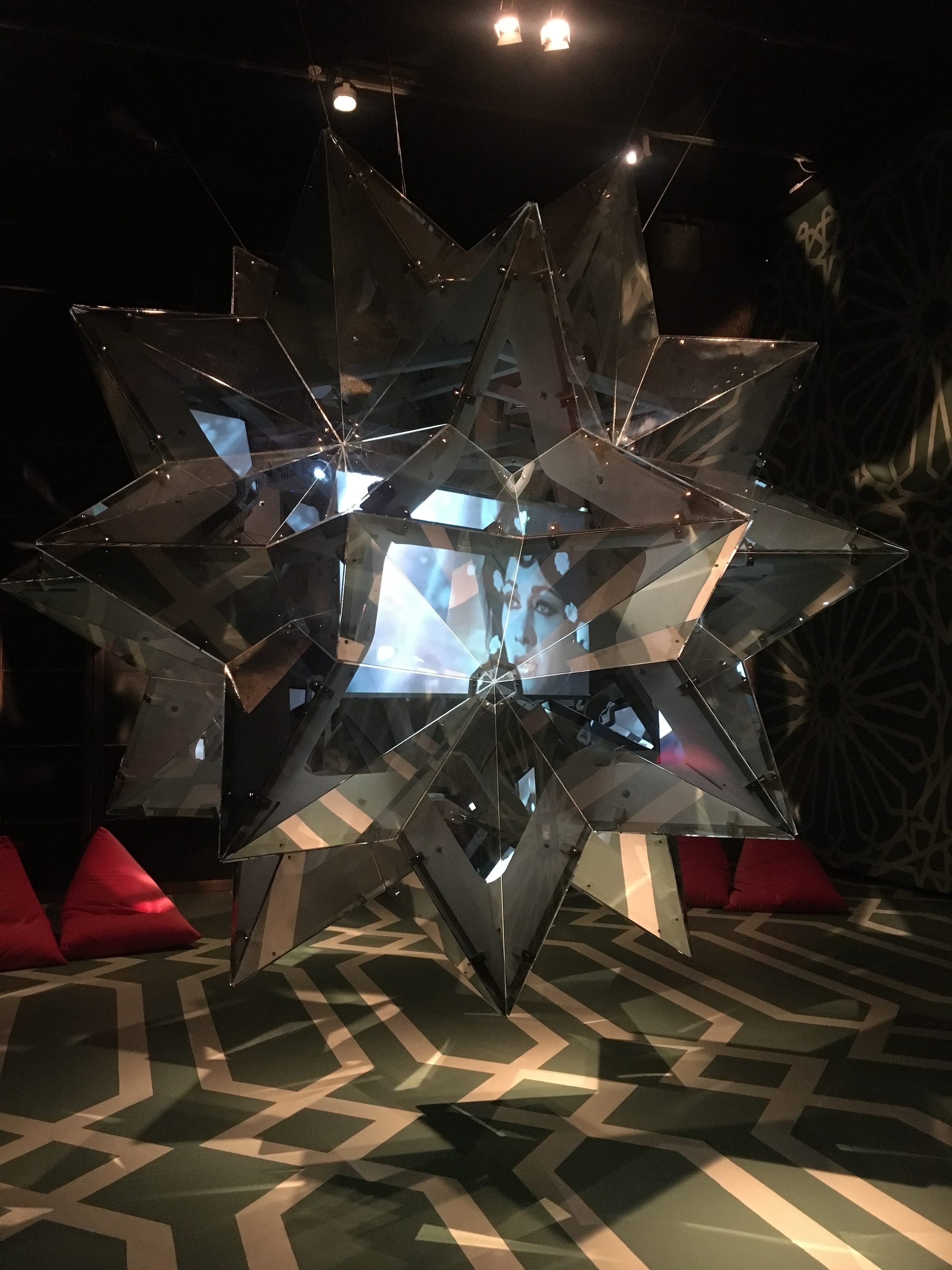 Sokhanvari’s use of colorful patterns references traditional Islamic designs found in mosques, which are intended to induce a sense of reverential awe in the viewer with their dizzying geometries. Islamic artists and artisans were prohibited from creating representations of people in holy sites, so Sokhanvari’s introduction of female figures into her temple of worship is political. So too is her inclusion of the Cosmic Dancers hologram videos, which show women dancing for an audience — an act that has also been banned as “indecent” since the Revolution.